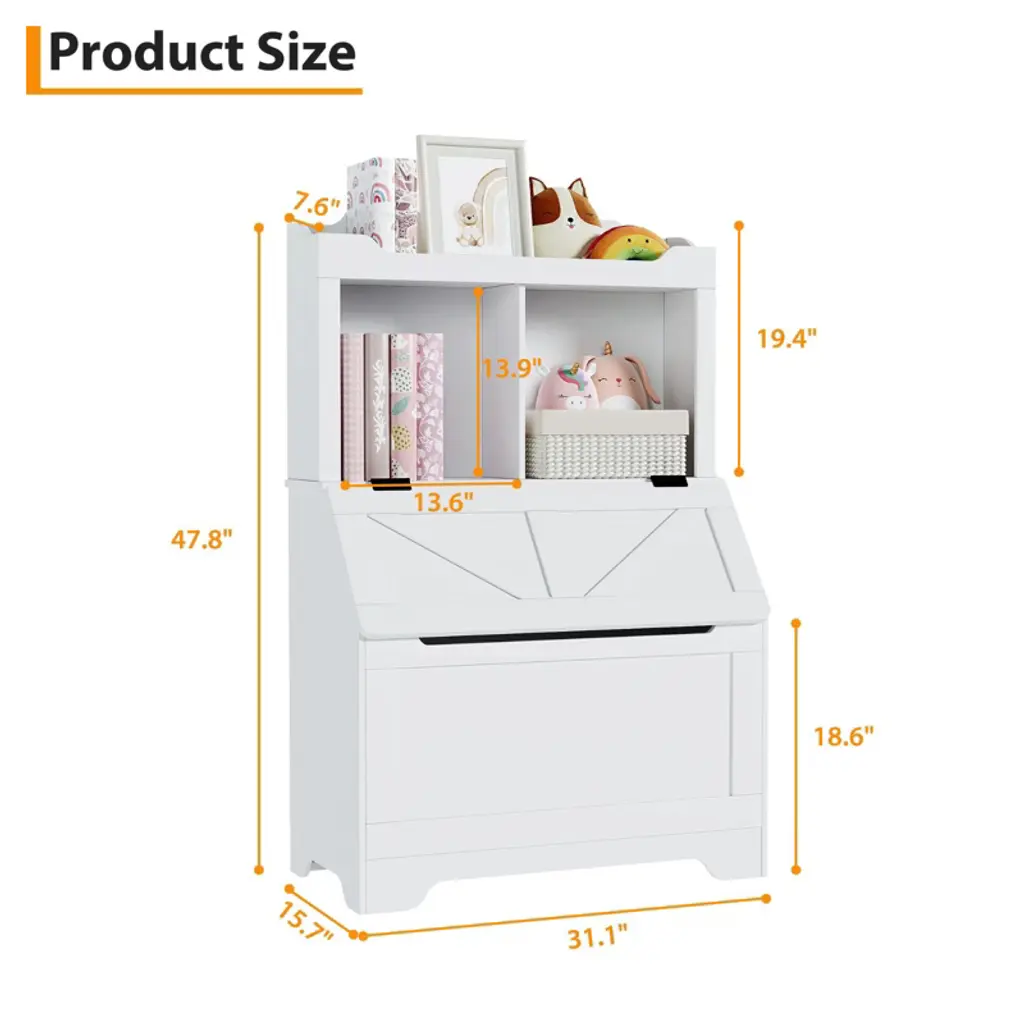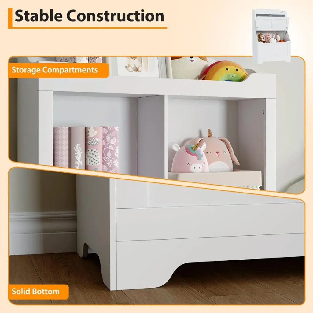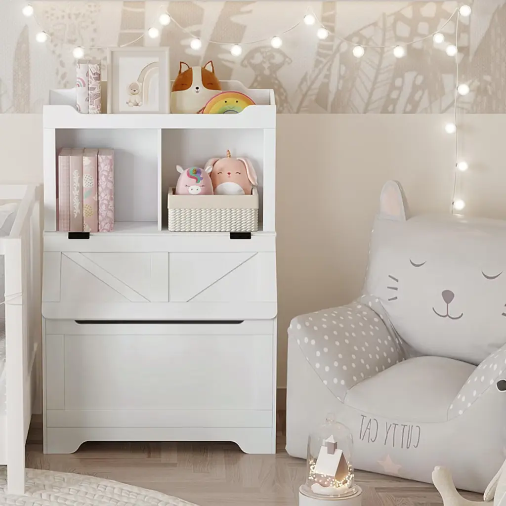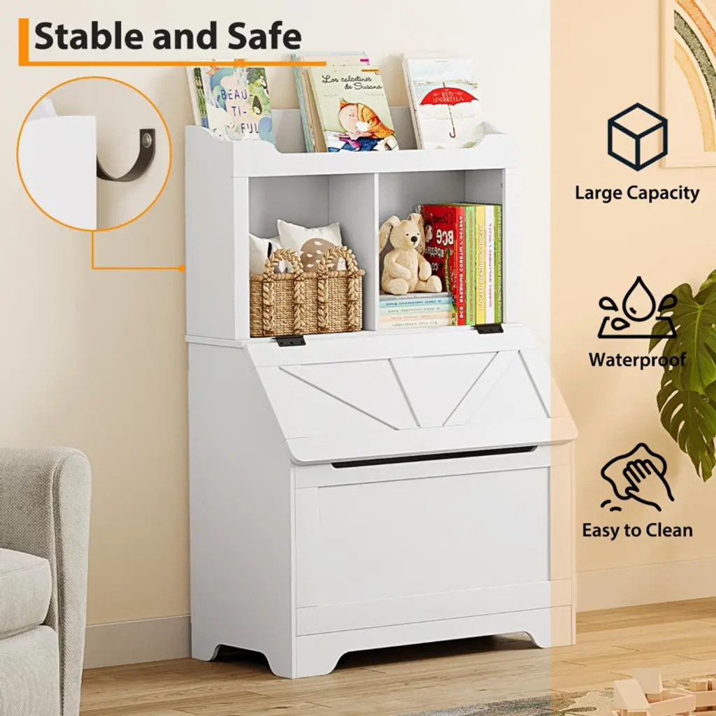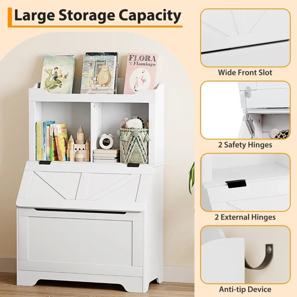 This wooden kid's storage cabinet offers an extra-large toy storage chest with a flip-top lid, and 3 open compartments for displaying books and other items.
