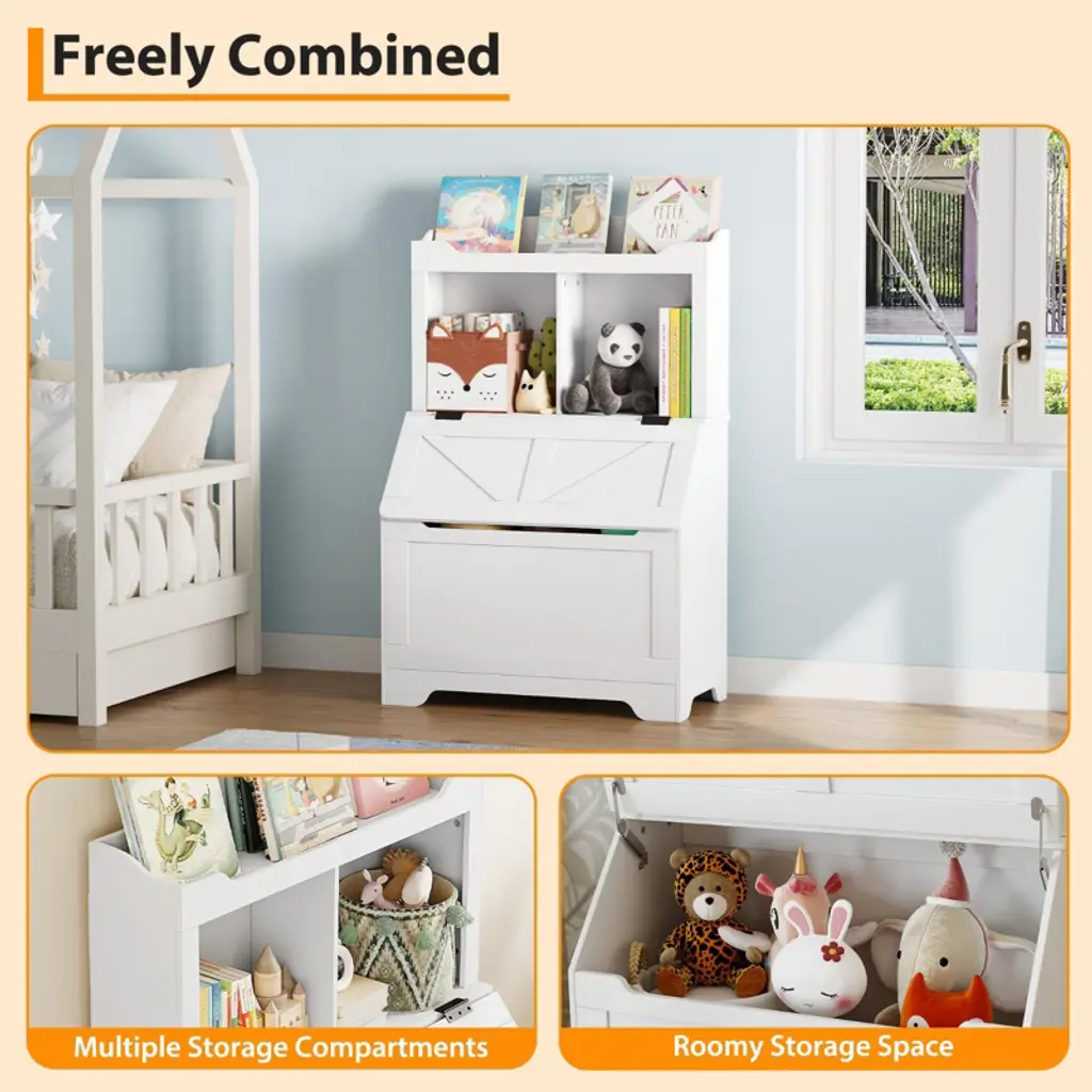 Kids Bookshelf And Toy Storage Organizer, Large Wooden Toy Box Chest With Flip-top Lid And Cubby, White