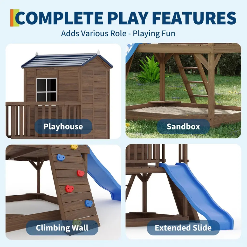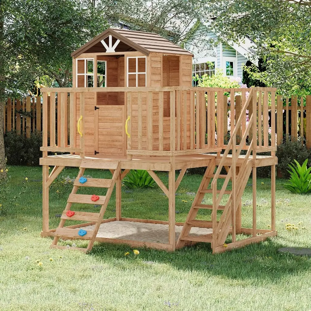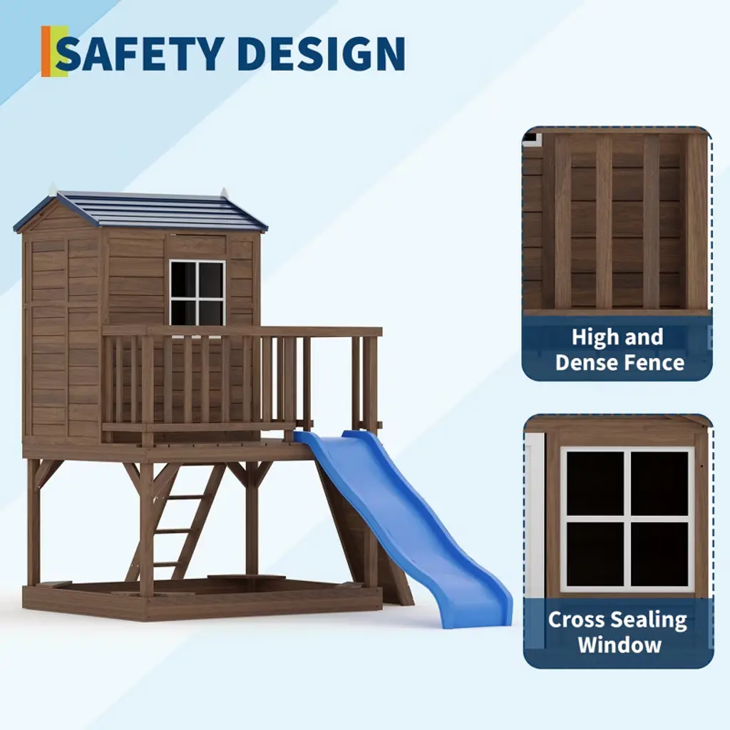 DURABLE & SAFE DESIGN - This kids clubhouse with slide is crafted from natural cedar wood, which is sturdy, durable, corrosion resistant, and sun-resistant. The wood surface is treated with outdoor water-based paint, making it suitable for use in harsh weather conditions. Its sturdy, thickened frame ensures excellent stability, providing a safe and secure play space for children aged 3-12SPACIOUS ENTERTAINMENT AREA - This kids playhouse with slide offers an outdoor play space for kids, with dimensions of 47.2x59.1.x89.4 inches, accommodating multiple children aged 3-12ELEVATED ADVENTURE - The elevated playhouse with slide with a wrap around deck adds a new level of fun while fitting into smaller backyardsSPEEDY WAVE SLIDE & SANDBOX COMBO - A high-rail 6-foot wave slide allows for swift, safe descents, promising endless fun every time.The base doubles as a spacious sandbox perfect for building sandcastles and sparking creativity. It’s double the fun in one compact designMULTI-FUNCTIONAL PLAY SCENES - Our elevated outdoor playhouse features many fun elements, including a climbing ladder, a playhouse, and a climbing wall. It not only fosters creativity but also helps improve children's social and emotional skills. This outdoor children's playhouse provides a place for kids to play outside, complete with a door and windows