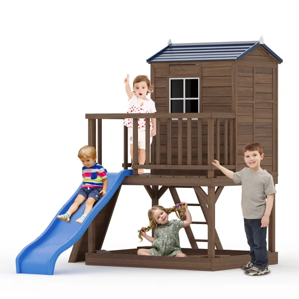 Kids Outdoor Playhouse With Slide, 2 Story Wooden Playhouse With Sandbox, Elevated Cedar Wooden Kids Playhouse With Step Ladder