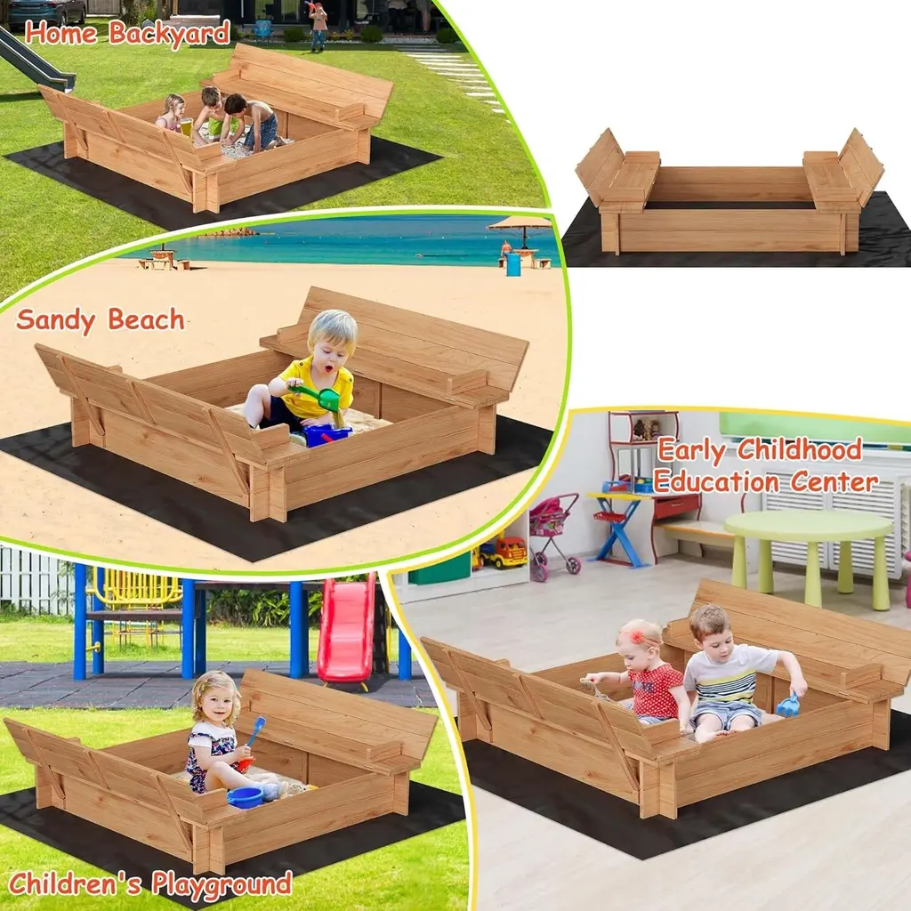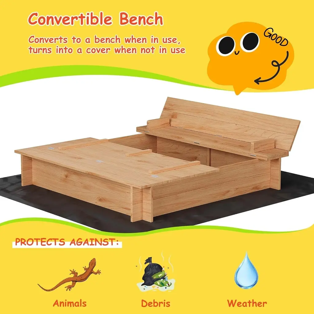 Durable & Safe Design: Made from non-toxic, sturdy stained cedar wood, this sandbox is built to last. The smooth surface ensures no rough edges, while the eco-friendly water-based stain preserves the natural wood color and keeps it safe for kids to play in. Comfortable & Functional Benches: Featuring two benches with backrests, this sandbox can comfortably accommodate multiple children at once (up to 200 lbs per bench). The added bench with a storage compartment provides extra convenience for keeping sand toys tidy and organized. Built-In Cover & Fold-Up Benches: When playtime is over, simply unfold the seats to create a protective cover for the sandbox. This design helps keep the sand clean and dry by preventing water puddles, ensuring a hygienic and enjoyable experience for kids. Large Play Area for Multiple Kids: With a spacious 47.2" design, this sandbox provides plenty of room for kids to dig, build, and explore together. It's the perfect outdoor play space for children to socialize and unleash their creativity. Ventilated & Bottomless Design: The bottomless structure promotes drainage and ventilation, preventing water buildup and allowing easy adjustment of sand depth. This feature ensures that the sandbox remains dry and clean, making it an ideal play area for kids in any backyard, garden, or outdoor space.