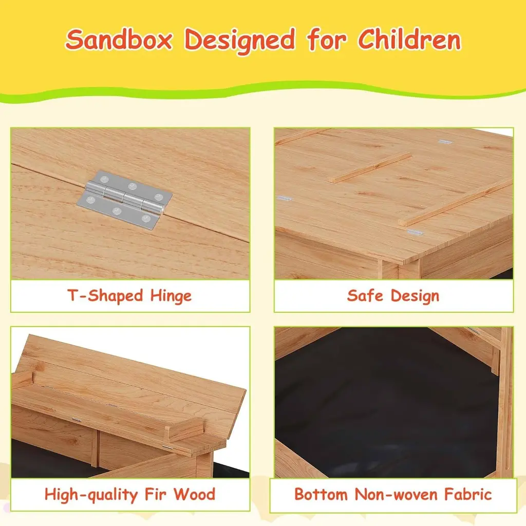 Kids Wood Sandbox With Cover, Spacious Outdoor Play Area With 2 Bench Seats For Ages 3-8 - Natural