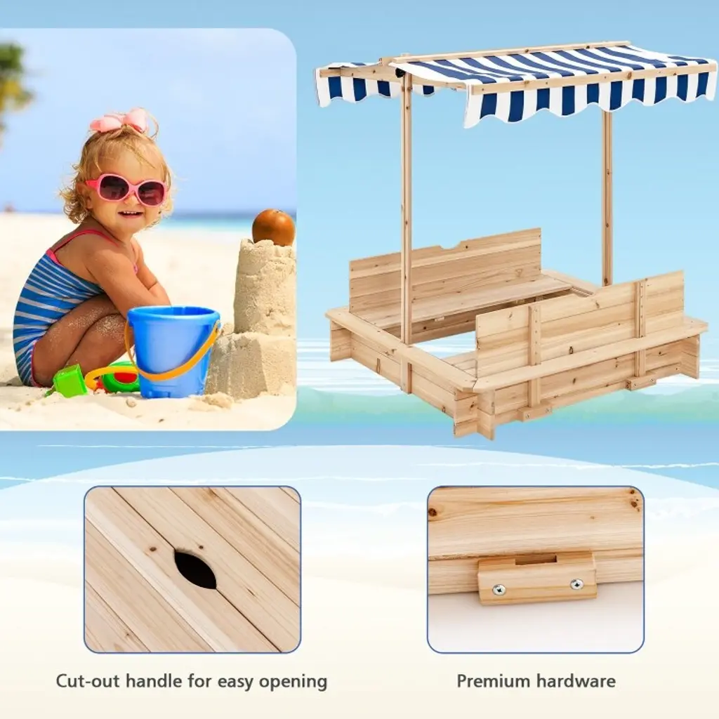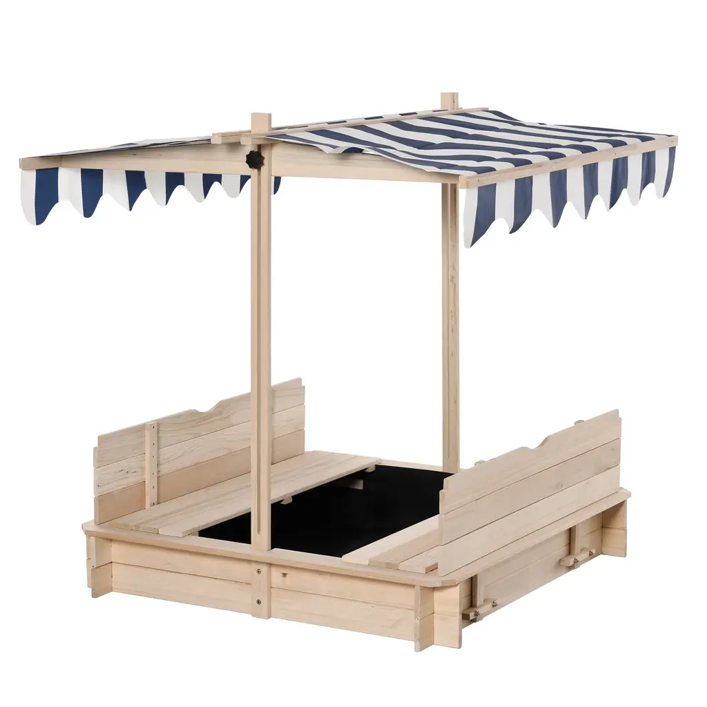 Kids Wooden Sandbox With Canopy And Foldable Bench Seats - 43.5'' X 42'' X 47.5'' (L X W X H) - Natural-Blue