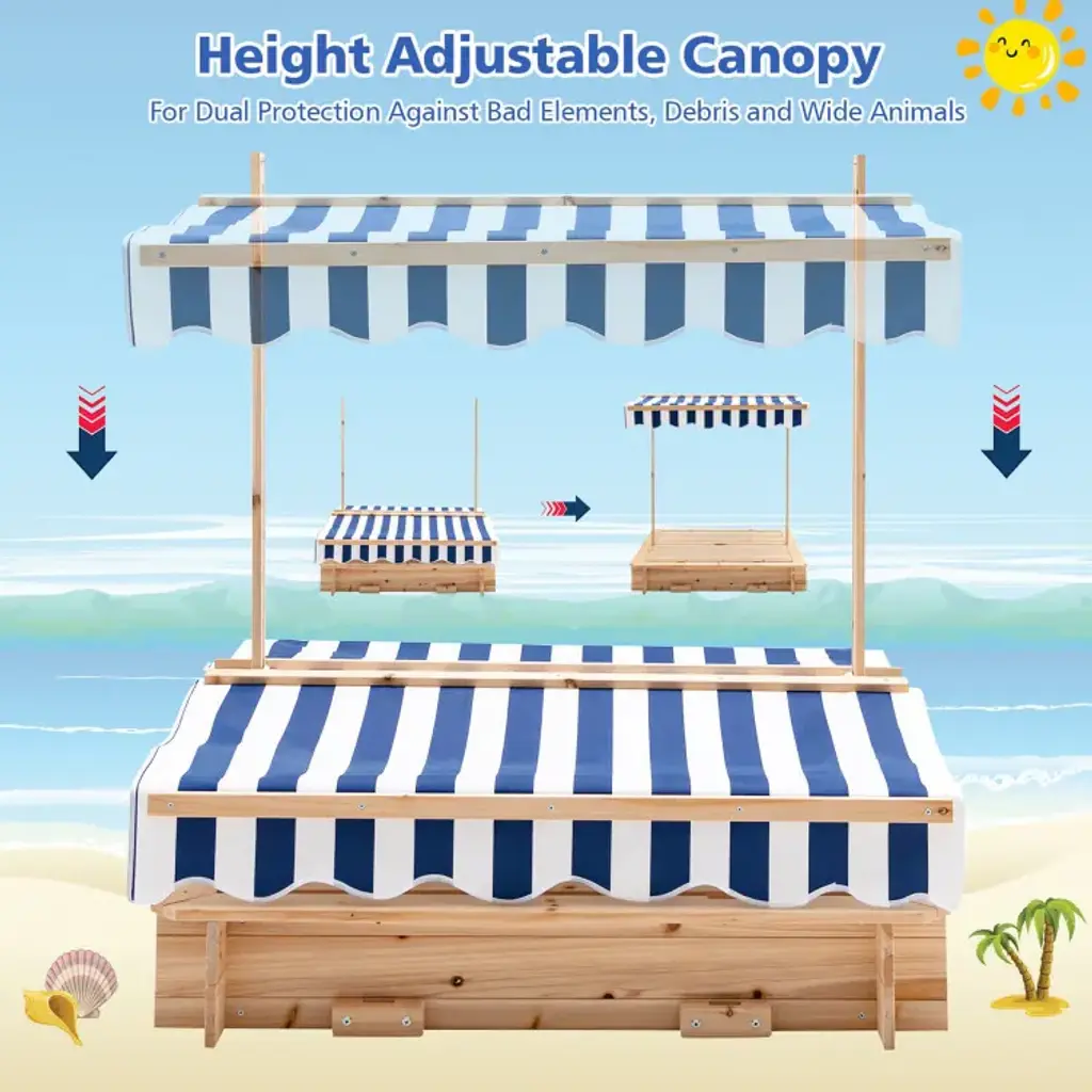 SpecificationsKey Features● Additional Bench Seating: This wooden sandbox is fitted with bench seating on 2 sides,allowing the kids to play sand while being comfortably sited. The backrests protect the kids from falling backwards and also offer back support. And the bench plates can be removed to enlarge the sand playing areas freely. ● Double Sand Protection: The bench seats freely fold up and convert into a wooden box lids to shelter the sand plies from wild animals,debris and bad weather elements.With that and a height adjustable roof which lowers all the way down to the end,this sand box doubles the protection of the sand. The cut-out handle enables you to open it easily. ● Water-proof Blue Stripe Canopy: Covered by a water-proof canopy,this kids'sandbox casts cooling shades during outdoor playing. And it can tilt 20 degrees to shelter your kids in large directions. The premium Oxford fabric is fade-resistant and tear-resistant for durable use. And the blue stripes meet kids'eyes. ● Solid Bottomless Cedar Construction: With great natural cedar material comes with great quality and reliability. Each bench can bear a maximum weight of 110 lbs. And the bottomless design has no limitation of sand depth and also facilitates drainage,ventilation and keeps the sand pile clean for kids to dig. ● Minimal Assembly Required: This wooden sandbox requires minimal assembly. We will send you the detailed instructions with understandable steps to help you with the installation. Each part is clearly labeled to simplify the process. The finished size will be 43.5 x 42 x 47.5 inches,actual sand area of 35.5'' x 28'' (L x W).