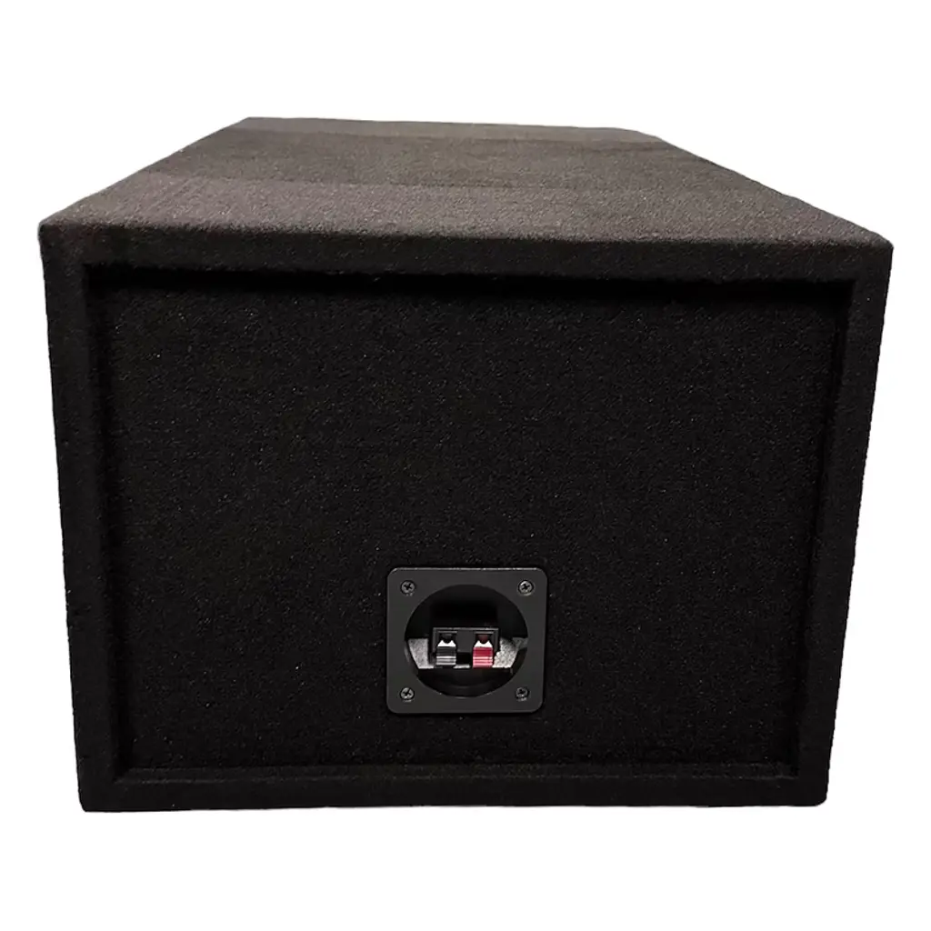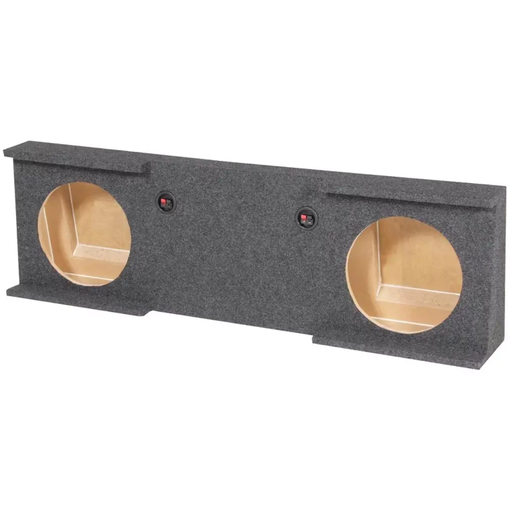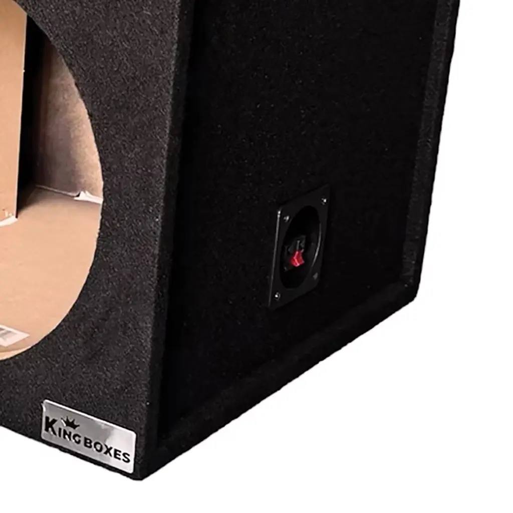 The D12V by King Boxes should be your go-to subwoofer enclosure to add two 10-in. speakers to your vehicle. It can hold up to 500-watt RMS subwoofers! It's stapled and glued so there’s no need to worry about loose wood. The carpeted dual subwoofer box has a port in the middle that is shared by both chambers.
