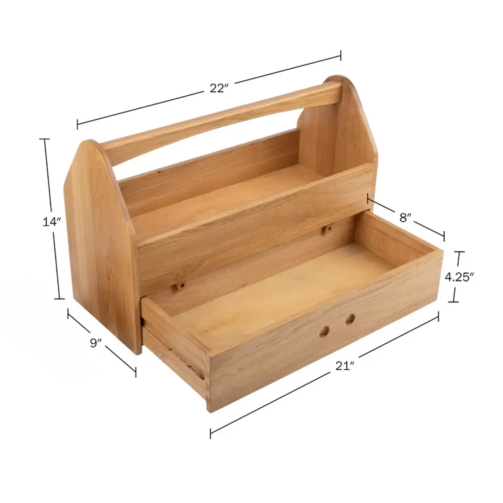 Organize and transport gardening tools, crafting supplies, carpentry tools, and more with the Tool Box Caddy with Handle by Kings County Tools. This hobby box is constructed from sturdy oak wood and poplar plywood for lasting durability and rugged good looks. The tool caddy with handle features a removable 3-compartment insert and a long bottom drawer, providing a versatile mix of open and closed storage ideal for organizing assorted tools or using for art supply storage. Kings County Tools is your source for premium woodworking tools and tool storage solutions that feature quality construction and smart design.