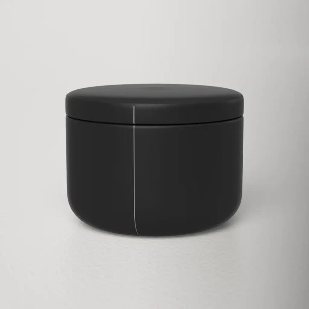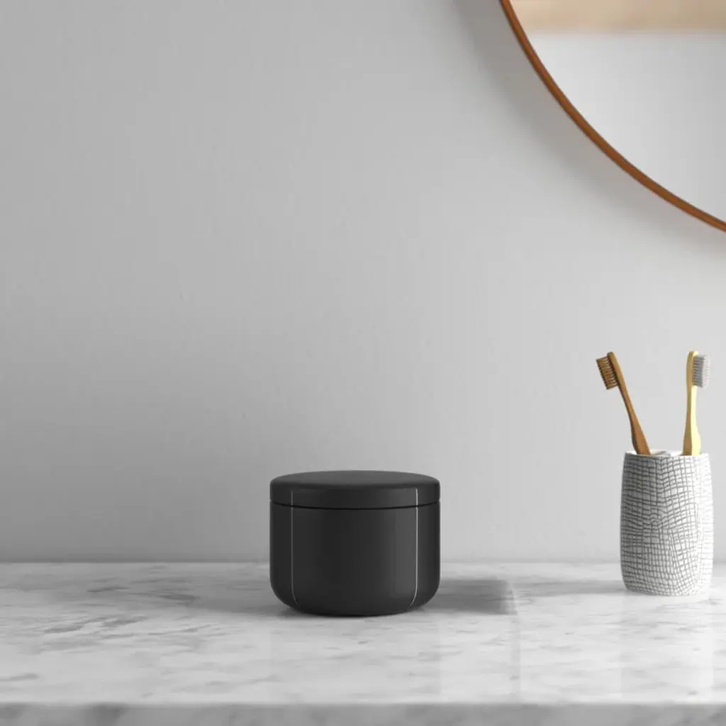 Tidier toiletries. This storage container’s minimal lines bring an uncluttered look to your bathroom countertop. It’s crafted from water-resistant stoneware with a smooth black finish and embellished with a painted white stripe. Ideal for stashing medicines, skin care products, or grooming tools.