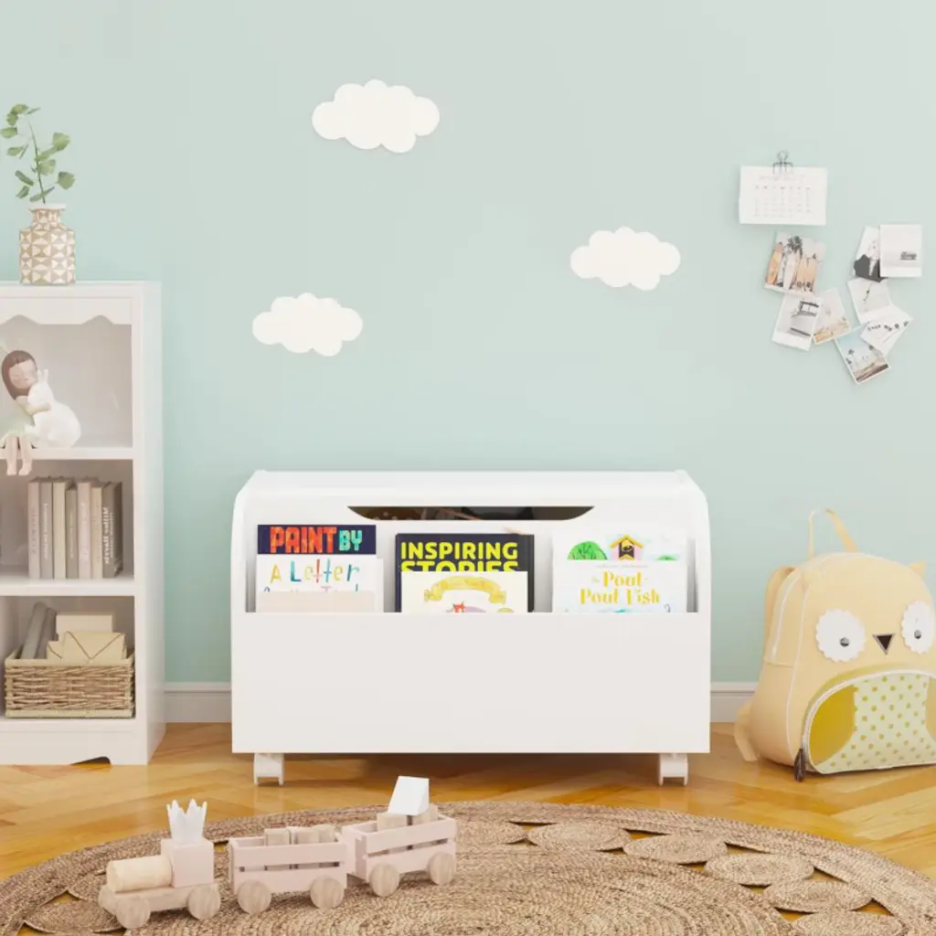 Ktmbdw Wooden Toy Box With 4 Universal Wheels,kids Toy Storage Organizer With Front Bookshelf,flip-top Lid,safety Hinge, For Playroom Kids Room,white
