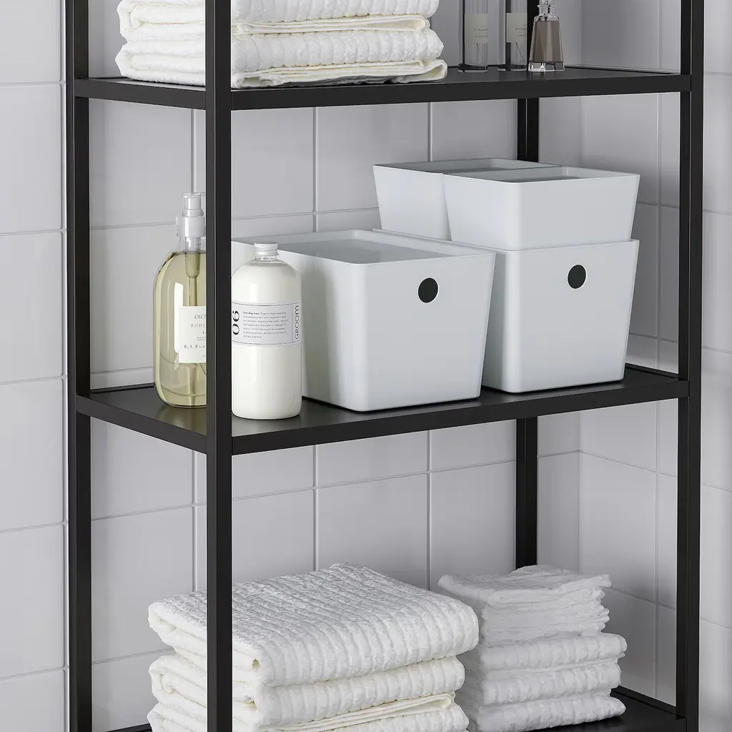 KUGGIS Box with lid - white 7x10 ¼x6 ". Helps you to keep everything organized, from desk accessories to makeup and other small things. Fits BILLY bookcase and other units with shelves which are at least 7⅛" deep. You can easily stack boxes of different sizes, as they’re made to fit each other.