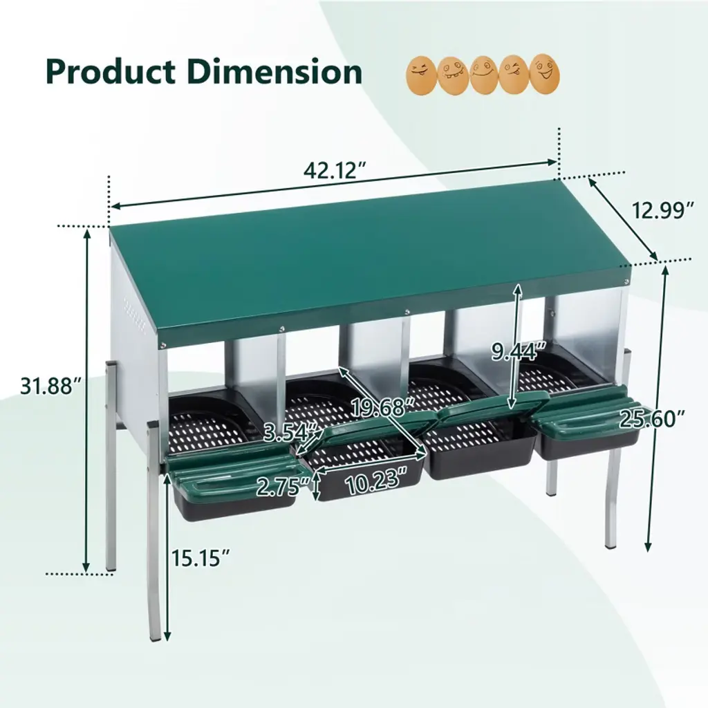This versatile 4-compartment chicken nesting box offers flexible installation options with both free-standing legs and wall-mount capabilities, providing optimal egg production conditions for your flock. Measuring 42.12" L x 12.99" W x 31.88" H, this poultry nest features a durable galvanized steel construction that withstands harsh weather conditions while reinforced ventilation holes maintain dry, comfortable conditions for your hens. The innovative egg collection system includes slightly inclined floors that gently roll freshly laid eggs into accessible trays, eliminating the need to reach inside the compartments. The removable collection tray simplifies cleaning with quick rinse capability, and the comprehensive hardware kit enables easy assembly with clear instructions. Perfect for backyard coops and small farms, this hen house accessory combines functionality with durability for reliable egg production.