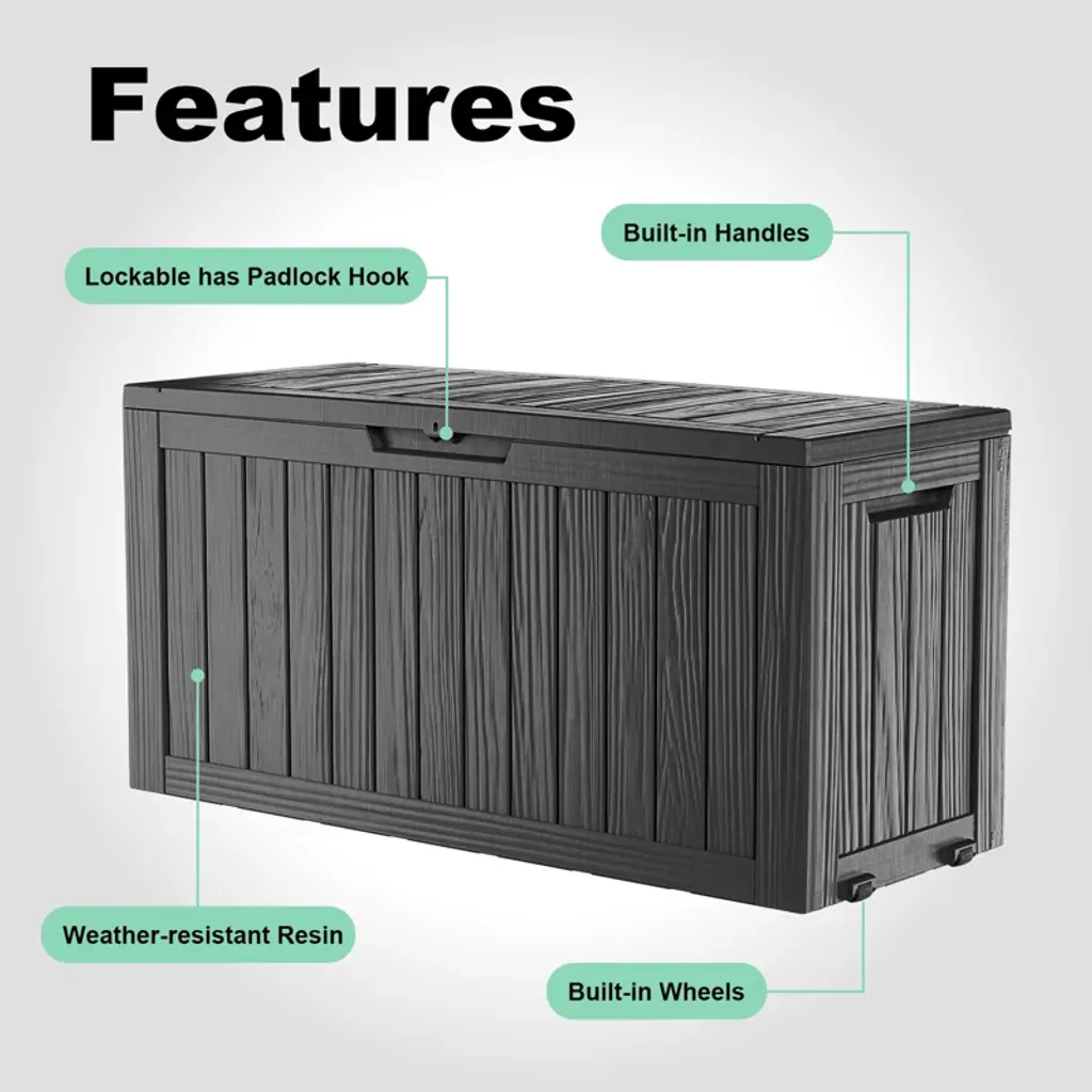 Upgrade your outdoor storage with this spacious 270L/72Gal box, perfect for keeping cushions, pool toys, and garden tools neatly organized. Crafted from heavy-duty polypropylene resin, it resists rust, dents, and peeling while standing up to year-round weather conditions. The elegant rattan-inspired finish adds a modern, upscale look to any patio or deck, and the lockable lid provides added security for your belongings. UV protection helps maintain its color and strength under the sun, while its KD design ensures easy assembly and effortless cleaning.