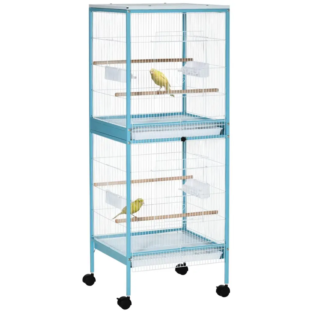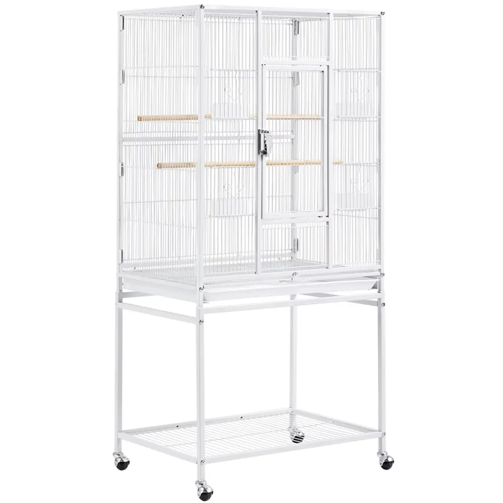 The bird cage is equipped with multiple wooden perches and plastic troughs, providing feathered friends with ample space to play and rest, creating a comfortable and interesting living environment. The design of the large front door, multiple sliding food doors and side doors allows you to easily take food, water and clean the internal area. The bottom rack can also be used to place pet supplies, which is very practical. The bottom is equipped with a front slide-out tray, which is designed to catch bird food residues and can be easily slid out for cleaning,