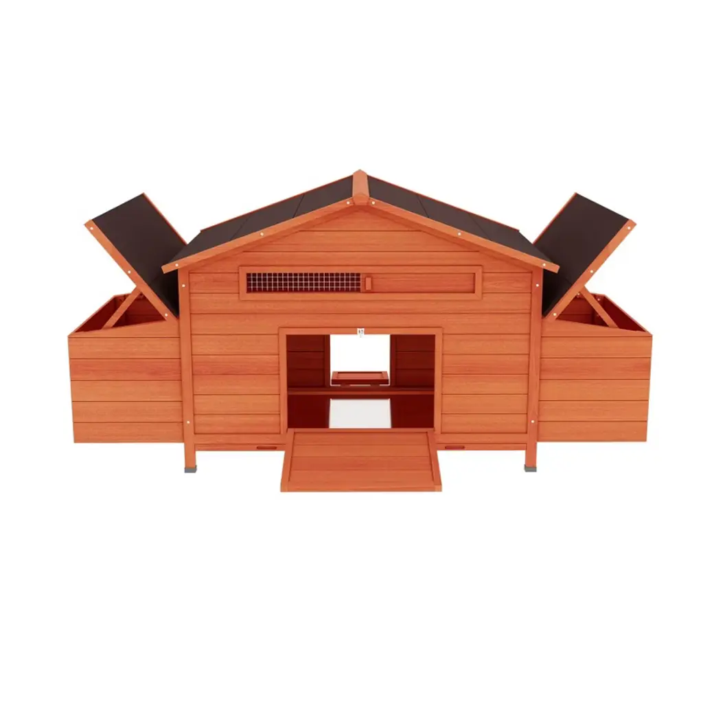 This spacious outdoor chicken coop provides 11.12 square feet of comfortable living space for your poultry, constructed from durable wood with protective moisture-resistant feet that prevent ground dampness and extend the structure's longevity. Measuring 67.7" L x 24.5" W x 35" H, this poultry house features two convenient free-range doors that allow your birds to move freely between confinement and open areas, plus two integrated nesting boxes for egg laying. The interior includes properly sized roosting perches that meet chicken behavioral needs, while front ventilation windows and rear air vents ensure optimal airflow in all seasons. Secure latches on all doors and windows provide predator protection during nighttime hours, making this chicken enclosure both functional and safe for your flock's daily needs.