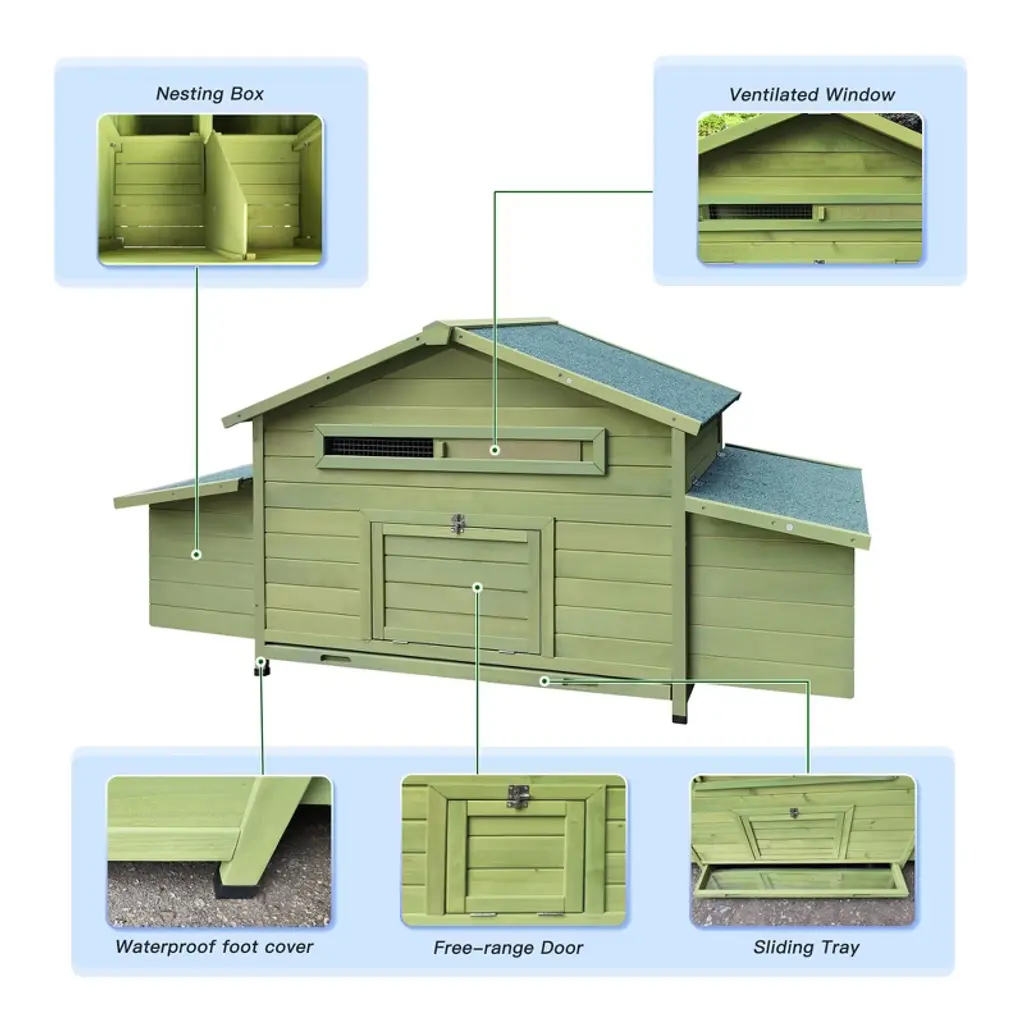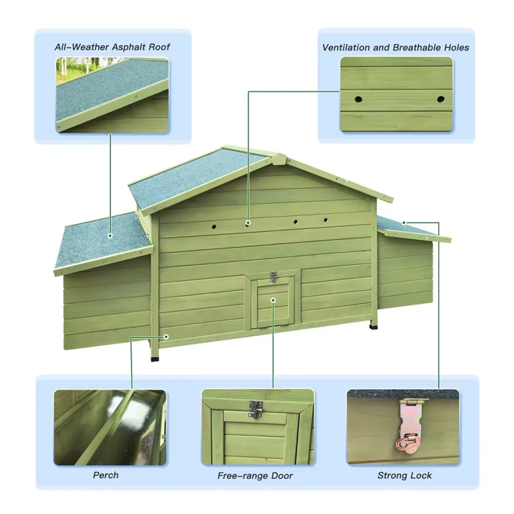 Kumasinova Large 11.12 Sq Ft Outdoor Chicken Coop,67.7" Poultry House With 2 Nesting Boxes,wooden Poultry Cage With Chicken Run&free-range Doors,green