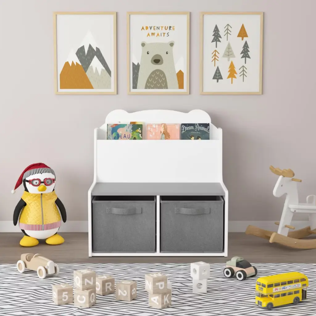 Kwpzqeb Toy Storage Organizer With 2 Drawers, Kids Bookshelf With Cute Bear-shaped Backboard & Open Shelf, Floor Toy Box For Nursery, Playroom, White
