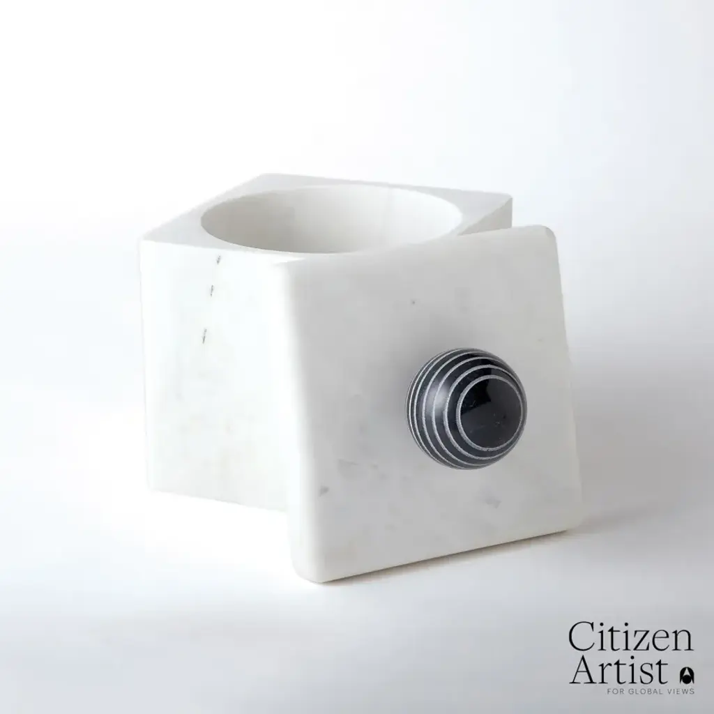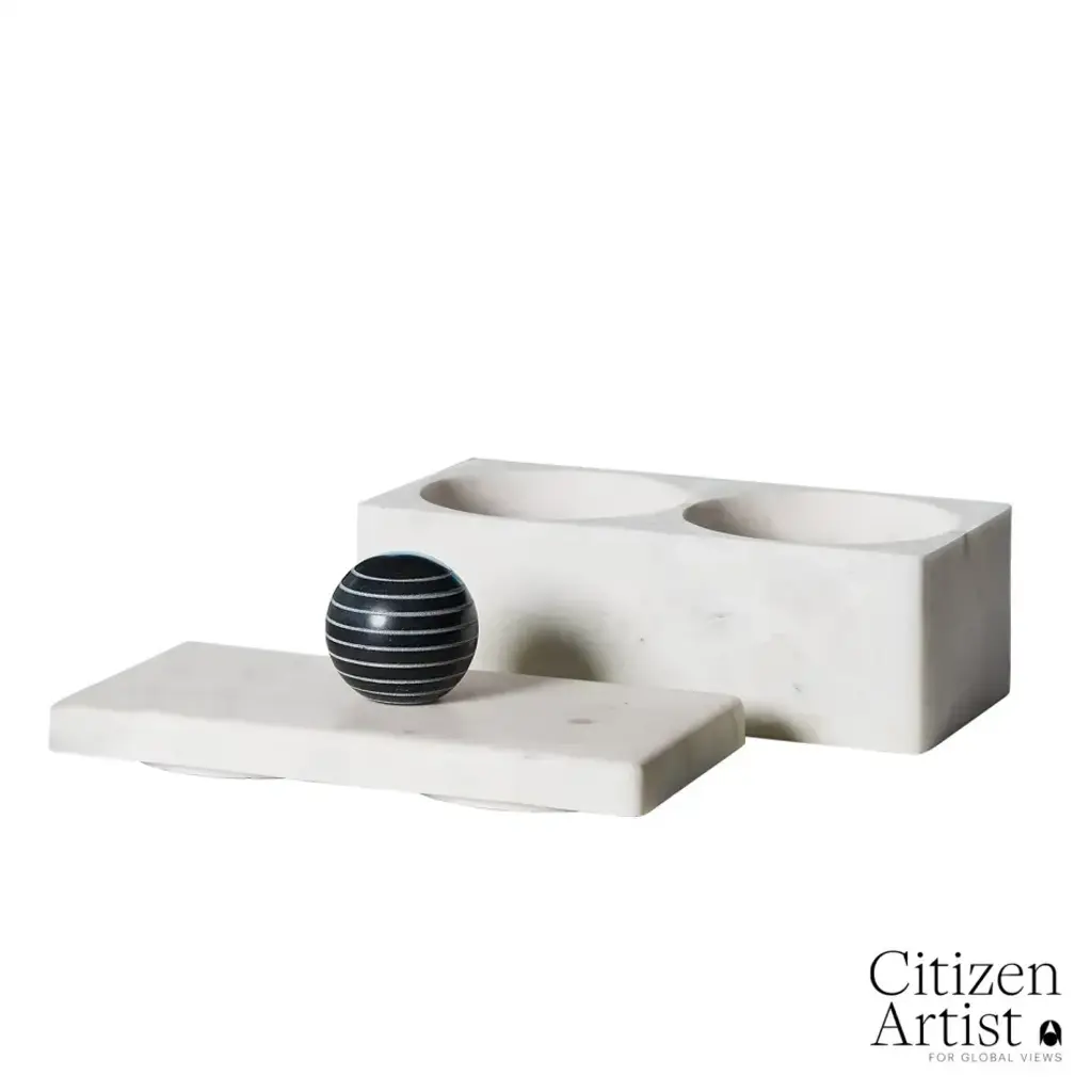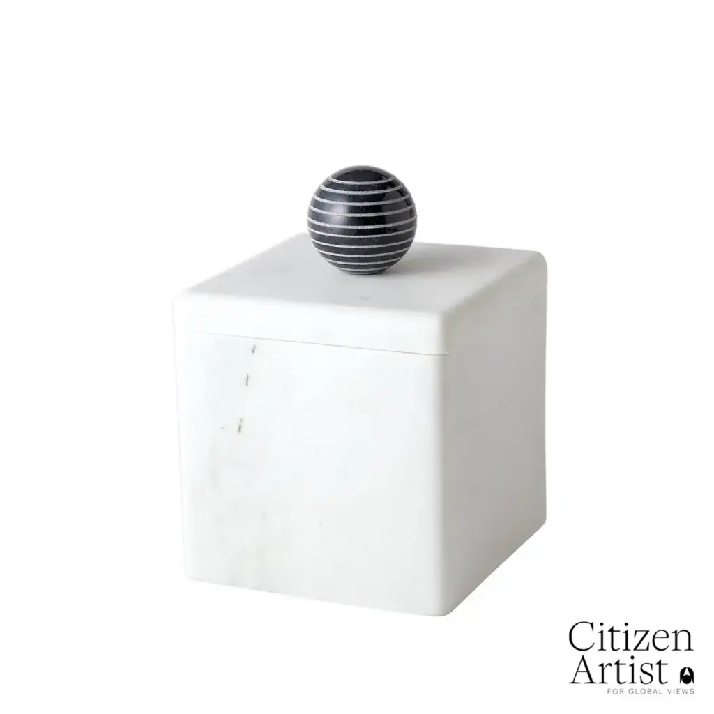 Carved from a solid piece of white marble with an etched black marble handle, La Boites elegant curves and bold proportions make it as visually arresting as it is functional. Available in three playful sizes. From a fashion forward perspective, Global Views offers accessories, furniture, statement lighting, and an assortment of rugs and mirrors to add beauty and joy to your home.