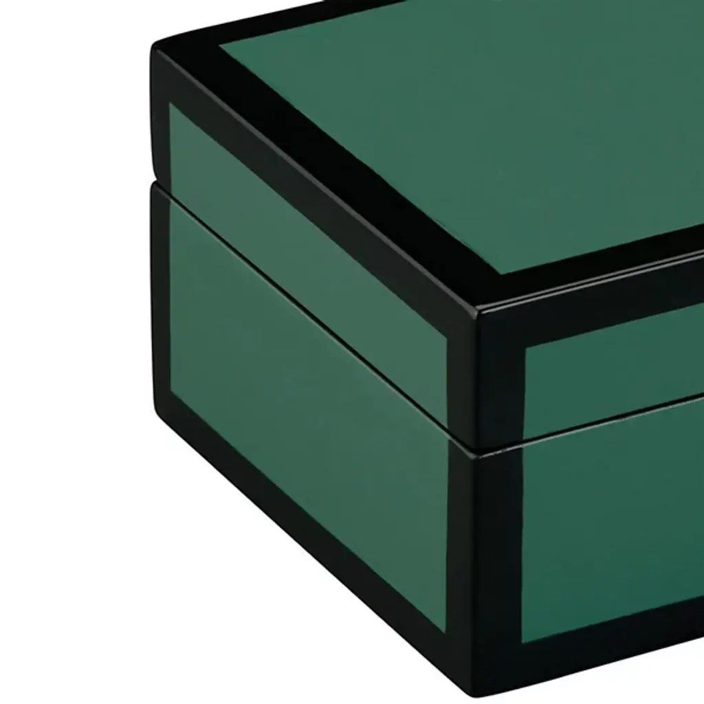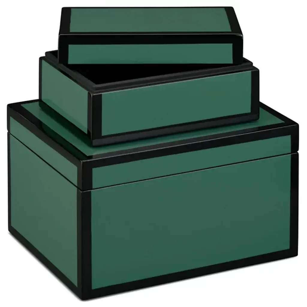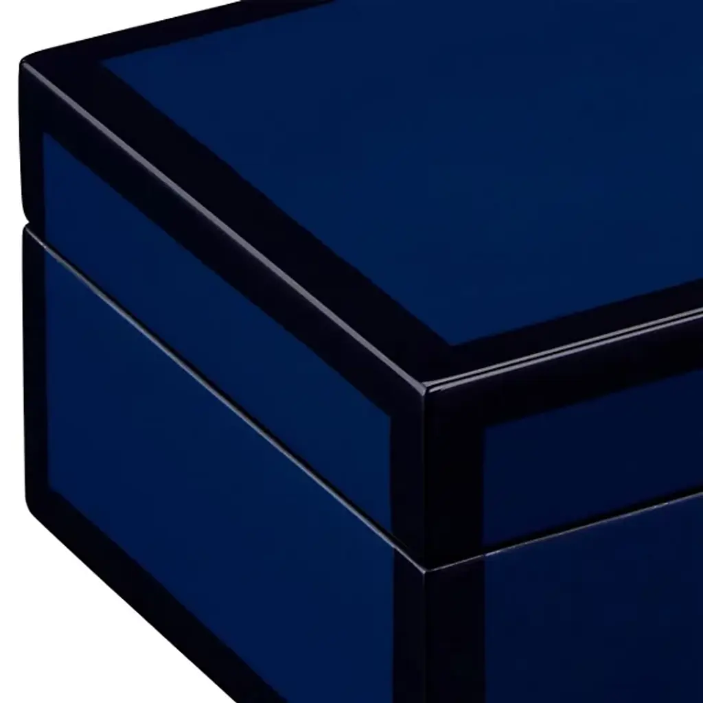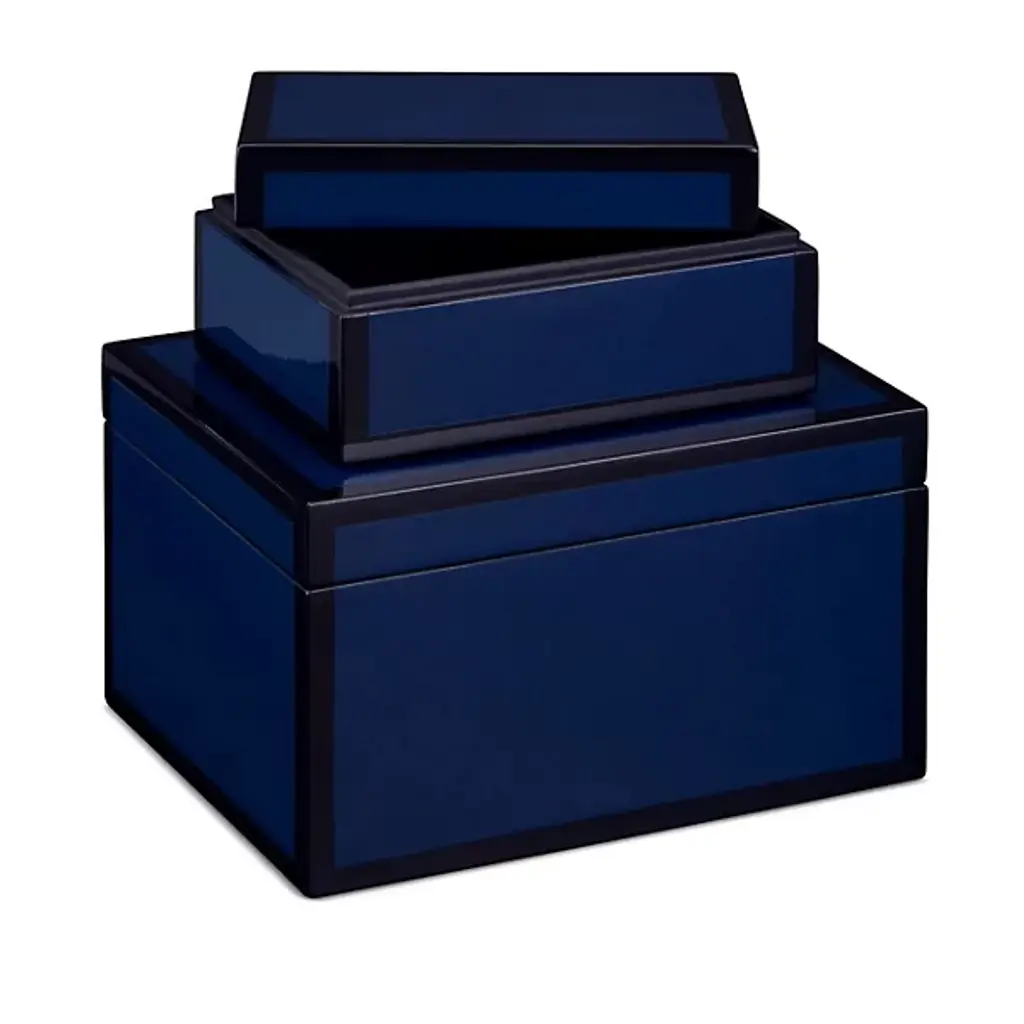 The Lacquer Box, Set of 2 from Currey & Company showcases the timeless allure of lacquer with its sleek, glossy surfaces. Crafted from wood, these boxes feature a rich navy finish, edged with black, and a matte black interior. The traditional lacquer technique adds a luxurious touch, while the boxes are designed to nest perfectly together, blending elegance with practicality.