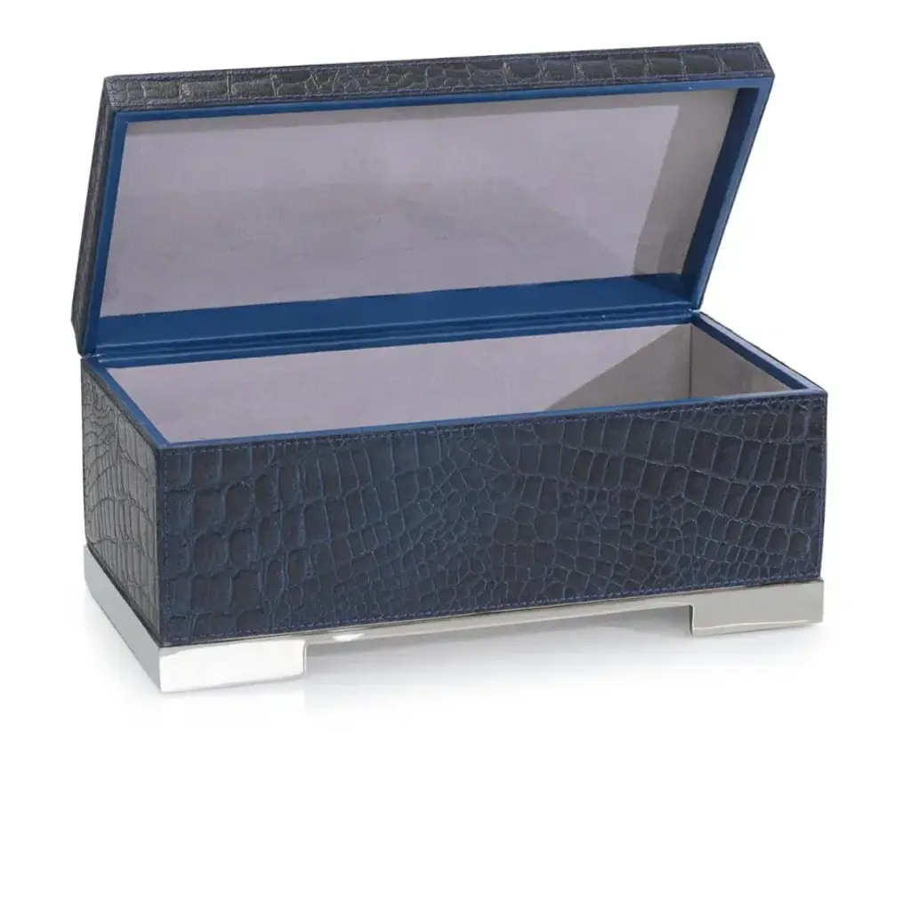 The Lafayette Box is a sophisticated vessel, providing style and utility in spades. Wrapped in a gorgeous blue leather, the piece features steel accents in a nickel finish. Perched on top of the lid, a gem-shaped nugget of crushed glass has been embedded into a nickel fixture.