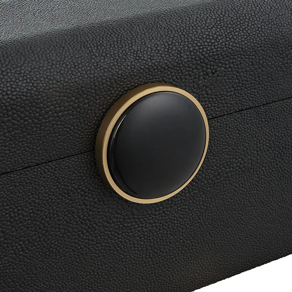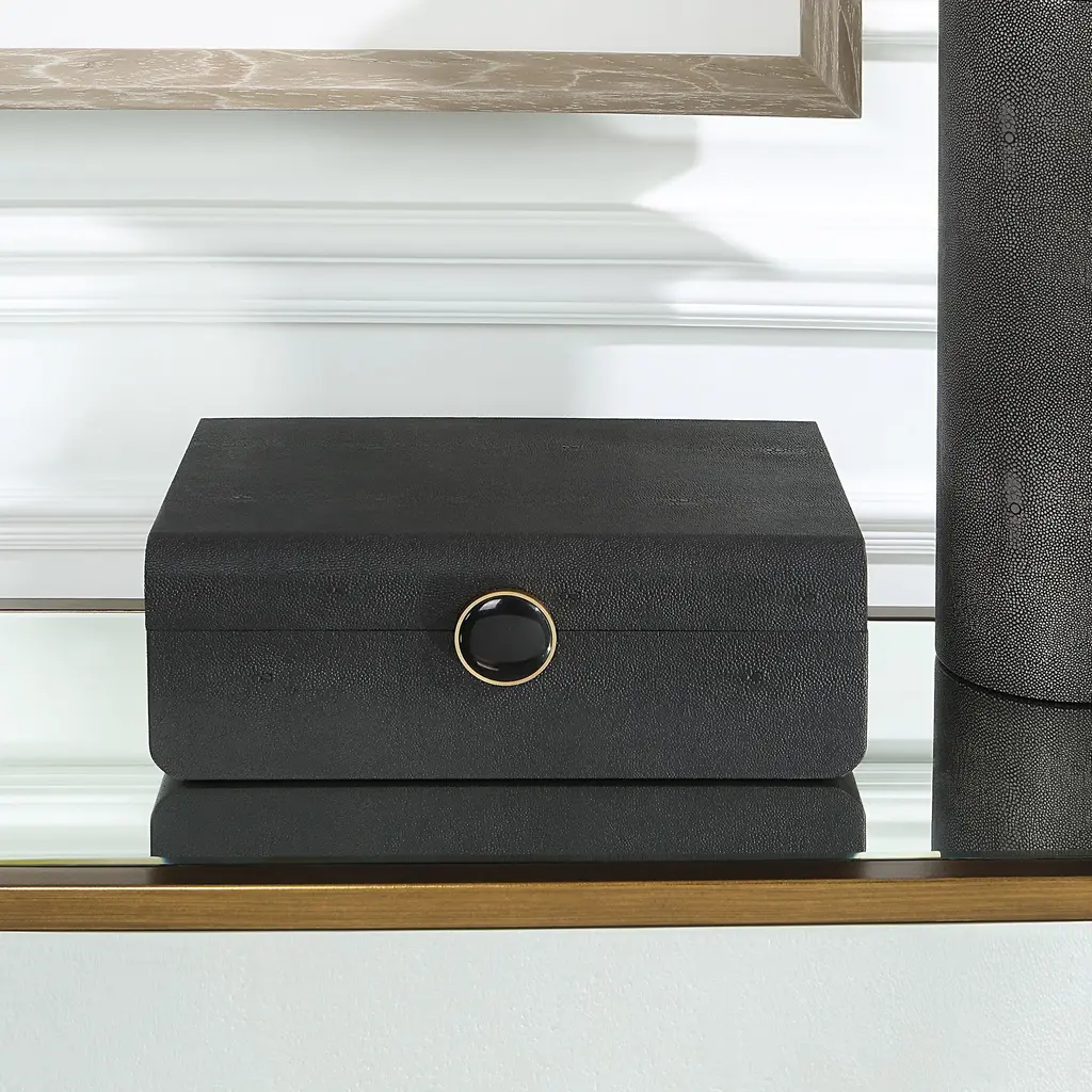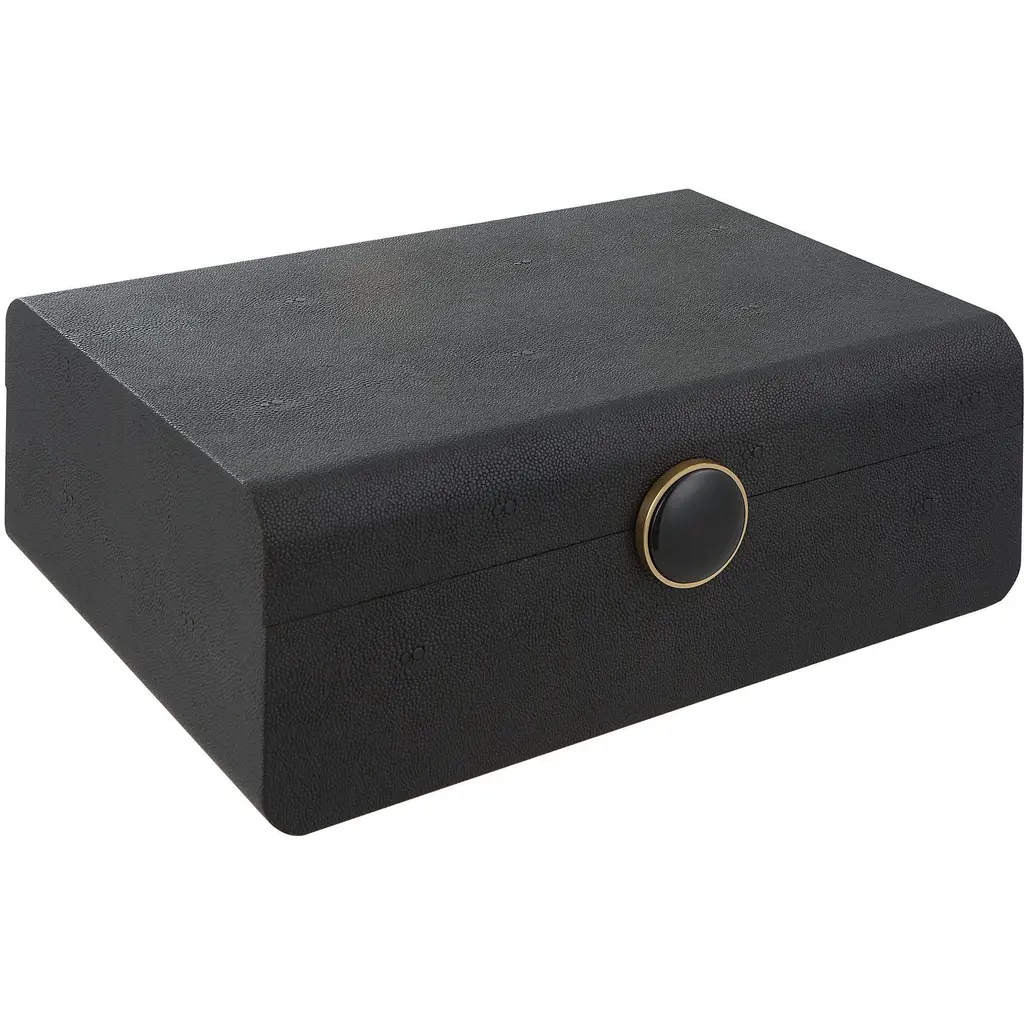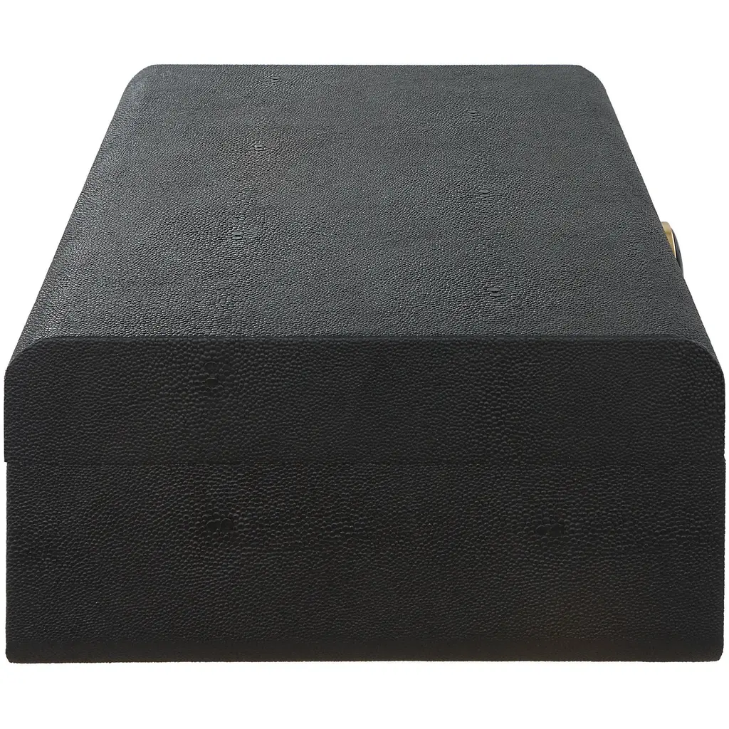 Inspired By The Art Deco Era, This Decorative Box Showcases A Faux Black Shagreen Wrapped Exterior Accented By A Brushed Antique Brass And Black Enamel Closure. The Interior Is Finished In Matte Black.