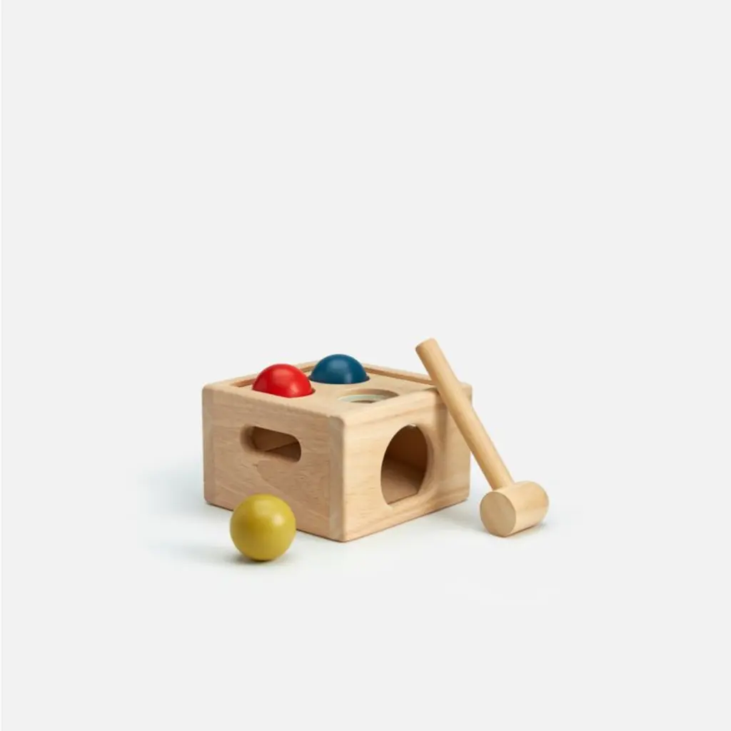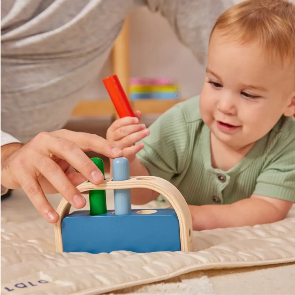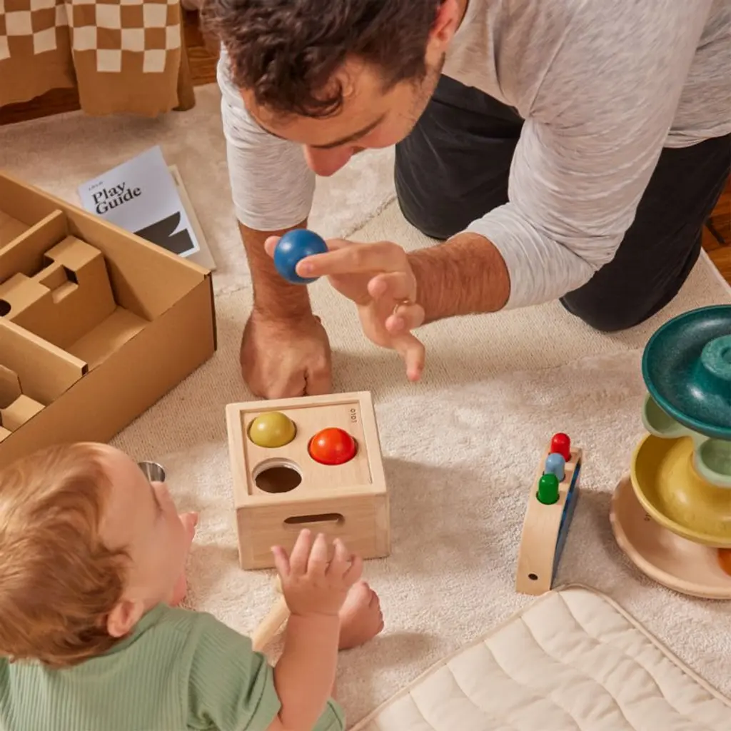 Time for some purposeful play! Designed by child development experts, Lalo's curated bundle of Montessori-inspired toys will keep 11- to 12-month-olds blissfully busy, while supporting their readiness for more complex concepts. As babies roll colored balls down a twirly track, they engage both social and fine motor skills. The peg toy is designed for big laughs and confidence building: As kids push pegs down, they automatically pop back up. Little ones can practice grasping and hand-eye coordinationand gain a better understanding of cause and effectwith a hammer ring toy. And the open-ended design of the stainless-steel cups encourages babies to find inventive ways to stack, fill and pour them. Crafted with durable materials, everything is designed to last for multiple years (and kids).