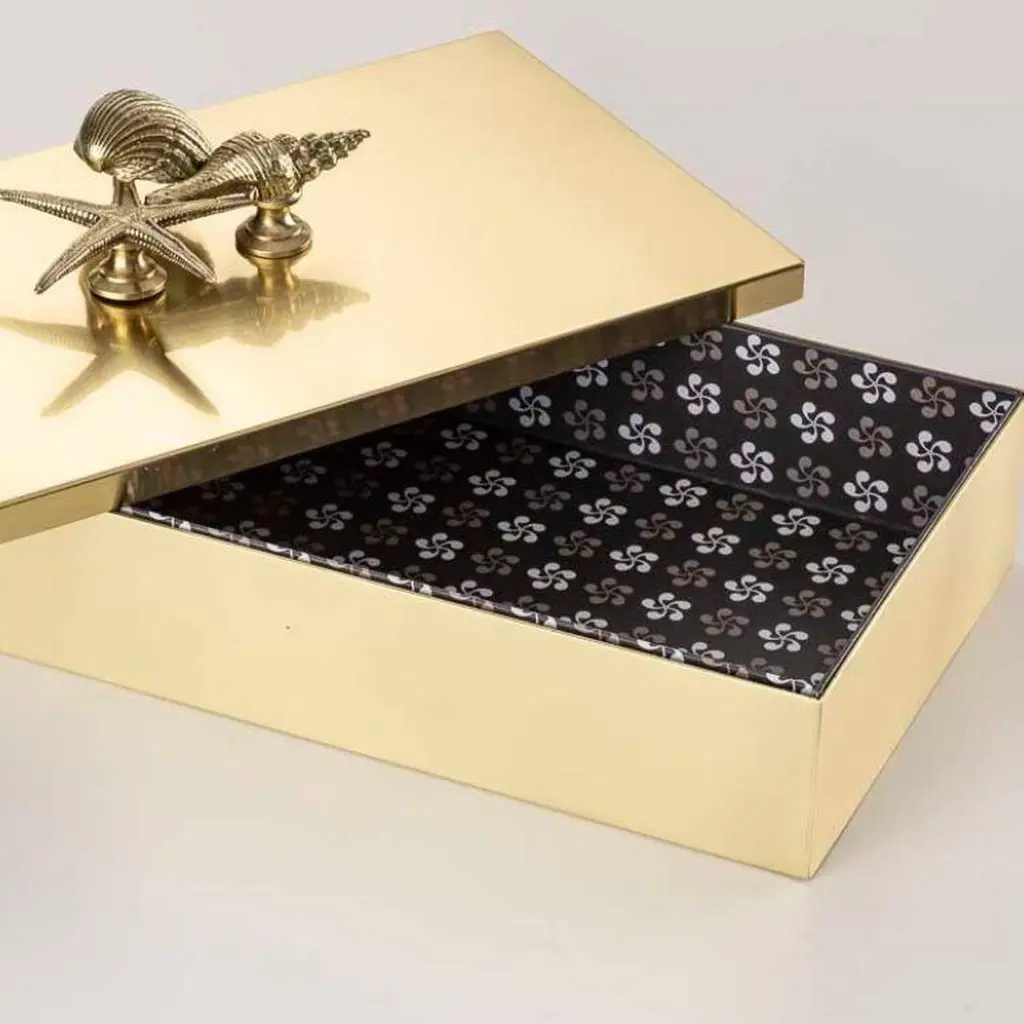 Add a touch of elegance to your home with our charming brass box. Perfect as a storage or decorative item, it features a charming decorated paper cover and a pretty brass knob on the lid. Choose from various finishes and knobs to create your own unique piece.
