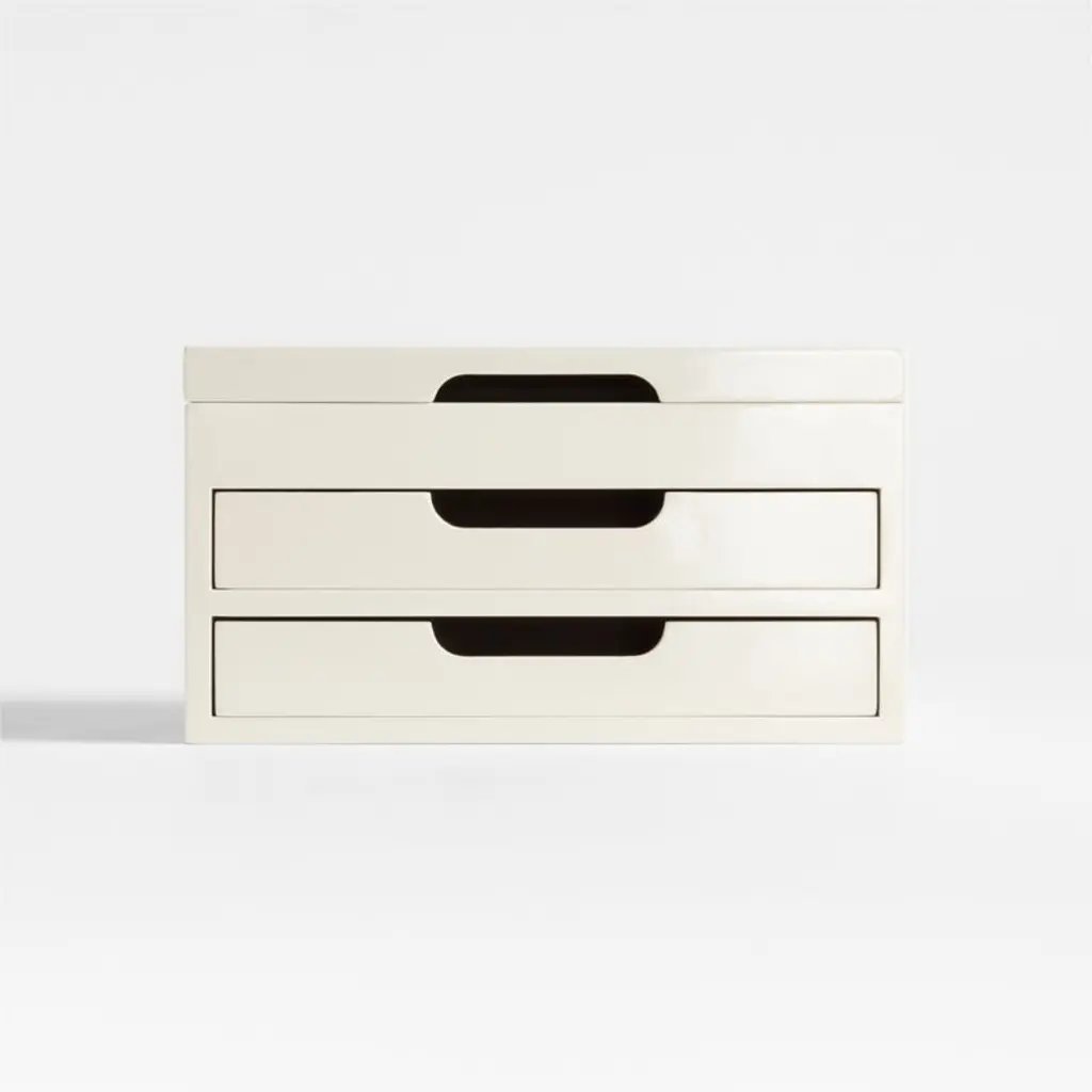 Our modern, minimalist storage box keeps your jewelry collection organized and accessible. Constructed of wood with a cream lacquer finish, the case boasts clean curves for a fresh look. Multiple compartments lined in soft grey velvet provide spots for your rings, earrings, bracelets, cufflinks, watches and more. Fitted with a mirror in its lid, the box also serves as a compact getting-ready stationor use the removable tray drawers to stage the pieces you plan to wear together. Our large jewelry box is a Crate & Barrel exclusive.