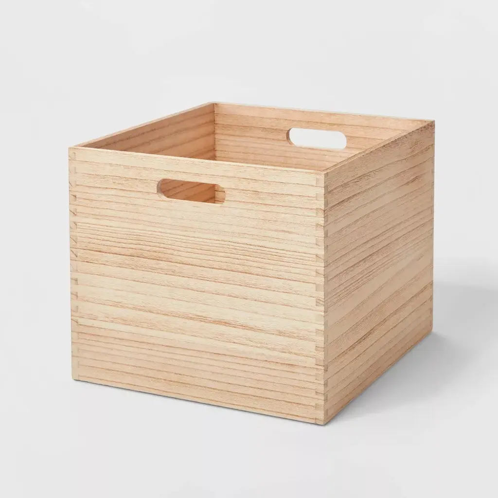 Simple yet stylish, this Large Decorative Light Wood Crate from Brightroom™ helps you keep everyday items conveniently organized and looking tidy. Featuring a simple square shape and wood construction, this woodgrain storage crate is suitable for stashing a variety of items, from books to office supplies to games and more. The open-top construction makes it easy to see the contents of the crate even on a shelf or in a cupboard, and the built-in handles make it simple to slide the bin out and grab what you need. Attractive enough to keep in the open, this wood storage crate is also compatible with the Brightroom 13-inch storage collection to use with shelves, utility carts and other storage solutions. Brightroom™ started with a simple truth: When you’ve got it together, you feel better. Our versatile designs reveal the possibility in every closet, cupboard and drawer, and work together to create brilliant ways to organize your every day. Overall Dimensions: 11 Inches (H), 13 Inches (W), 14 Inches (L) Bottom Dimensions: 13 Inches (W), 14 Inches (L) Interior Dimensions: 10.25 Inches (H), 12 Inches (W), 13 Inches (L)