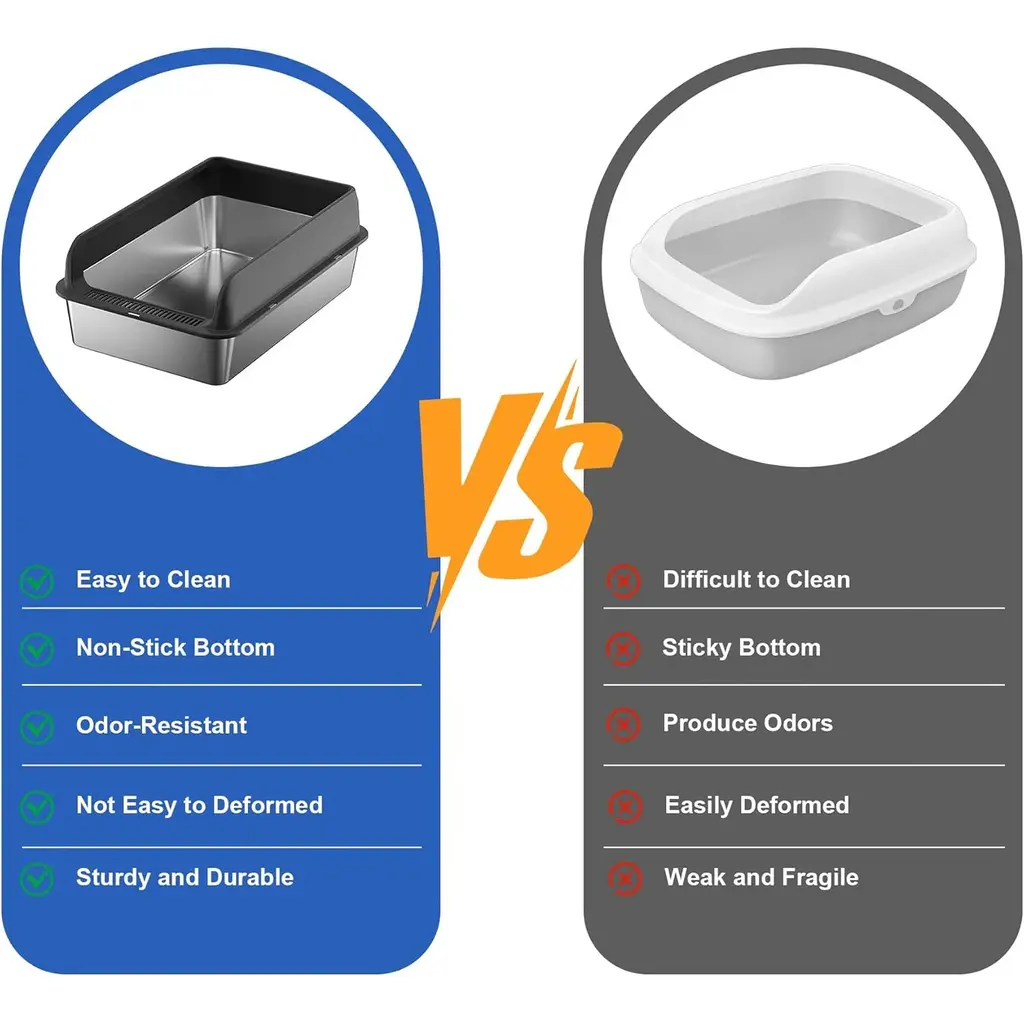 Spacious and High Capacity: With dimensions of 60x40x25cm/60x40x30cm, this litter box provides ample space for your cat. It can hold over 30 liters of litter, ensuring 3-5 days of usage without the need for frequent changes. Why Choose Stainless Steel Cat Litter Box: Unlike plastic cat litter boxes, stainless steel metal cat litter box never rusty, won't be scratched and collect any residue or odor, non-stick bottom, are easily to clean, have strong and durable, making it an economical and sustainable solution! Smart Hollow Litter Collection Mat: This litter mat is designed with a unique elongated hollow shape, making it suitable for various litter types. Its dual-layer design makes cleanup easy by allowing free flow back into the box. Easy To Clean Design: The smooth, non-stick surface of this stainless steel litter box allows for effortless cleaning; Waste slides off with a simple rinse, and unlike plastic, it won’t trap odors or stains, keeping your cat's space fresh and clean. Convenient Accessories: This litter box comes with a practical litter scoop for easy maintenance and includes 4 silent anti-slip pads to keep it stable and reduce noise during use, making it an