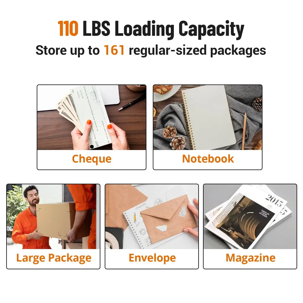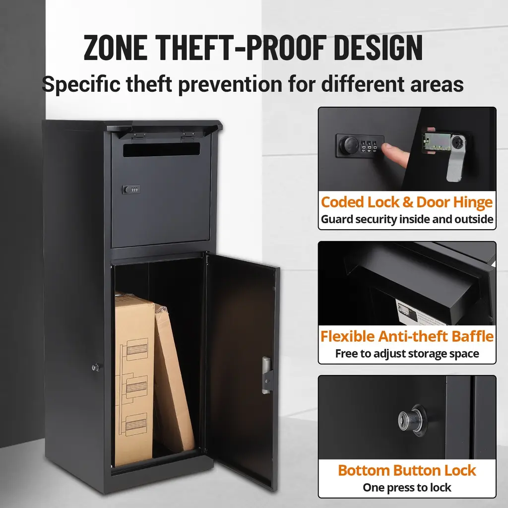 High-Quality Construction: This parcel drop box is made from 0.8mm thick galvanized steel, combined with a specialized spray-coating. This robust construction ensures that the box is highly durable, rust-resistant, and scratch-proof, providing long-lasting protection for your packages. Secure Coded Lock: With dimensions of 16.1" x 15.7" x 43.5", this package delivery drop box features a reliable coded lock and an internal hinge designed for maximum security. Say goodbye to the hassle of lost keys, knowing that your deliveries are safely stored. IPX3 Waterproof Design: Designed with an IPX3 rating and a waterproof strip, this delivery box can withstand harsh weather conditions, including typhoons, heavy rain, and snow. It ensures that your parcels remain clean and dry, regardless of the elements. Advanced Anti-Theft Features: Equipped with a large anti-theft baffle in the drop slot and an internal hinge, this package drop box is designed to prevent packages from being easily fished out. These advanced anti-theft features provide you with peace of mind and added security for your deliveries. Simple Installation: The package drop box is designed for easy installation, featuring pre-drilled holes and including screws. You can securely install it in just three simple steps on floors, porches, or curbside locations, ensuring that you can store and access your deliveries conveniently at any time.
