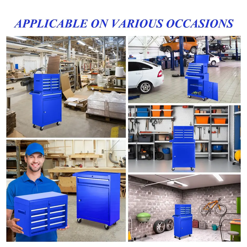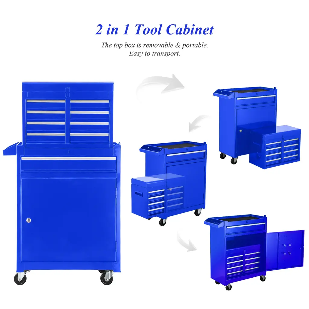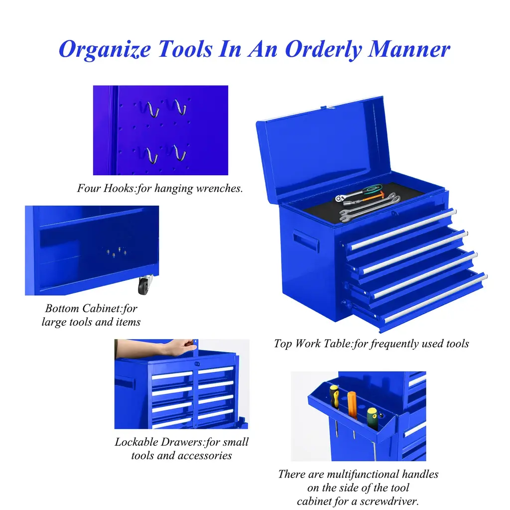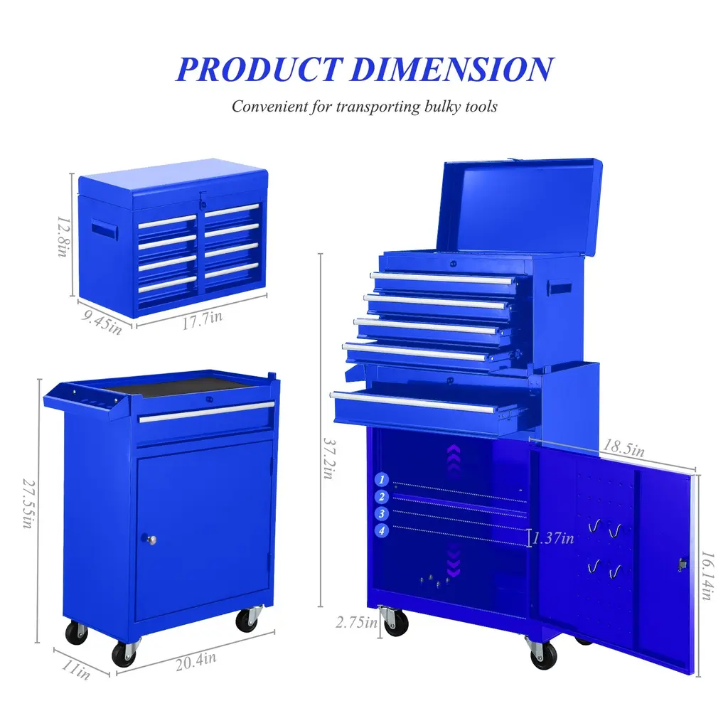 ✔ MULTI-FUNCTIONAL TOOL CHEST WITH DRAWERS:This tool cart on wheels can be disassembled into two:4-drawer tool box top chest and a rolling tool cabinet, which can be used separately or together according to your needs. Besides, the top tool box can also be stored inside the bottom cabinet to save space. ✔ LARGE TOOL CABINETS ON WHEELS:Tool boxes with top tray,5 drawers, large bottom cabinet,side tool rack and 4 removable hooks provide ample storage space for various tools such as screwdrivers, spanners, boxes, etc. And the 3 level adjustable shelf on the bottom cabinet allows you to customize the storage space. ✔ EASY TO MOVE:This rolling tool box has pull handle and 4 universal wheels make it easy to move the rolling tool chest around.This Tool cart assembled dimensions (in.):22.95 x 11x 47.25. ✔ EASY INSTALLATION:The garage tool box easy to install,it come with detailed instructions to help you with the installation. This rolling toolbox is great for home workshops and some professional environments and could be placed in the garage, workshop, warehouse, etc. ✔ PRACTICAL MECHANIC TOOL CART:Locking tool chest with drawers overall bearing capacity is 100KG. The bearing capacity of drawers is 15KG with ball guide rails.whether it is furniture maintenance, garage maintenance tools storage, automobile machinery or DIY anything you want, it can meet the requirements.