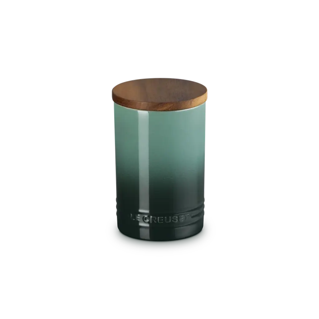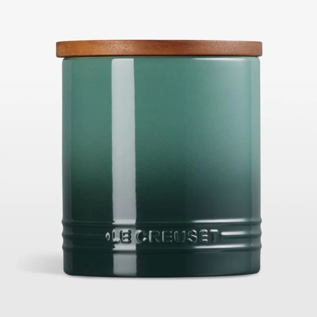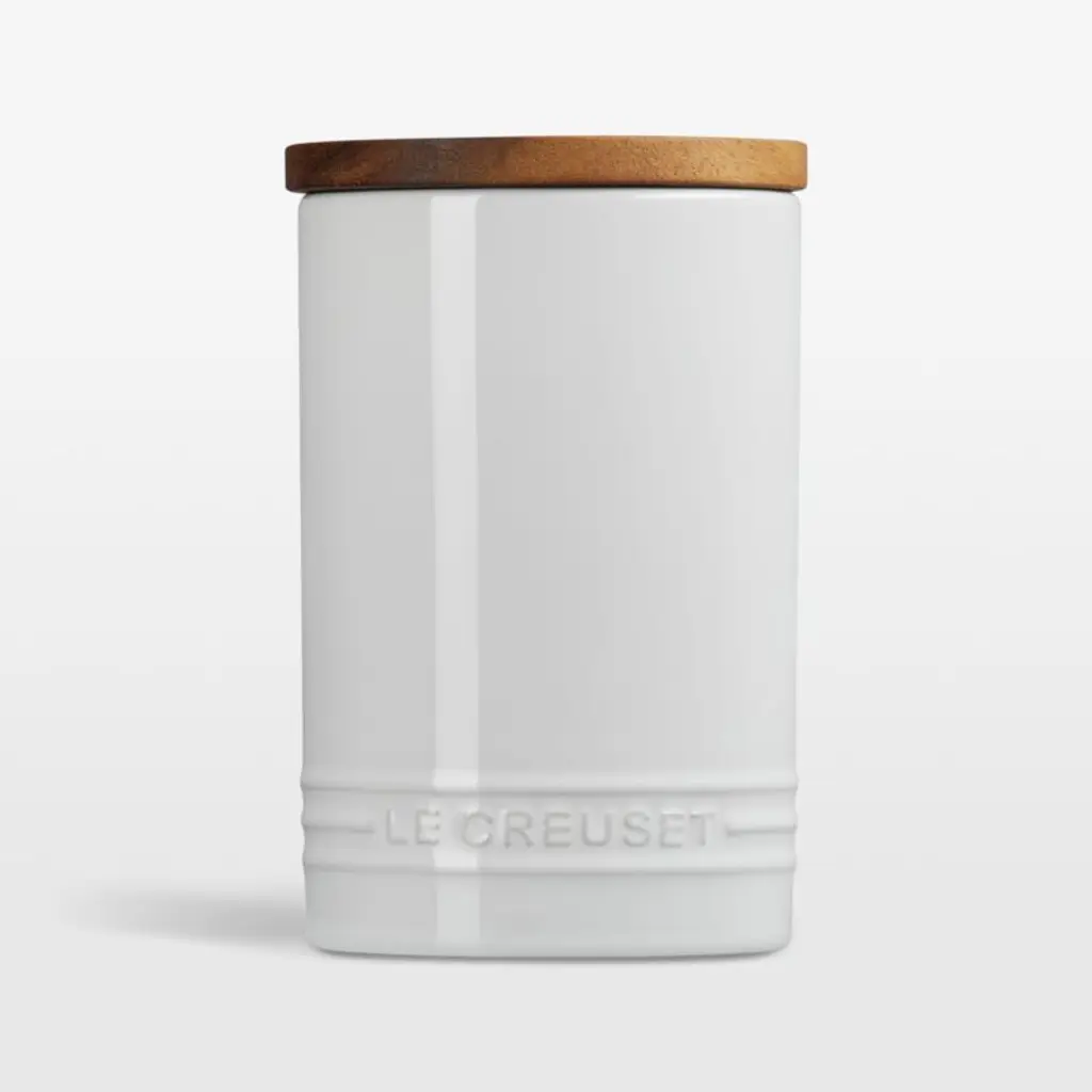 This cherry red canister graces a countertop or pantry with the same gorgeous color, classic design and well-crafted durability that made Le Creuset cookware famous. Made of premium stoneware, the clean-lined round container is glazed with glossy non-porous enamel that blocks moisture absorption and resists cracking and crazing. A beautifully grained acacia wood lid has a silicone gasket for an airtight seal. Also available in two complementary sizes in your choice of Le Creuset's signature hues, the small canister is debossed along the base with the company name and iconic ringed detail.