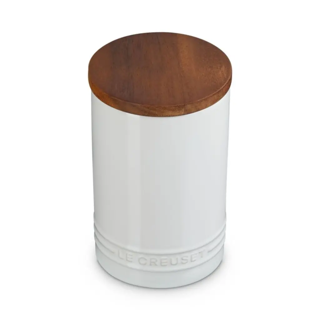 This bright white canister graces a countertop or pantry with the same gorgeous color, classic design and well-crafted durability that made Le Creuset cookware famous. Made of premium stoneware, the clean-lined round container is glazed with glossy non-porous enamel that blocks moisture absorption and resists cracking and crazing. A beautifully grained acacia wood lid has a silicone gasket for an airtight seal. Also available in two complementary sizes in your choice of Le Creuset's signature hues, the medium canister is debossed along the base with the company name and iconic ringed detail.