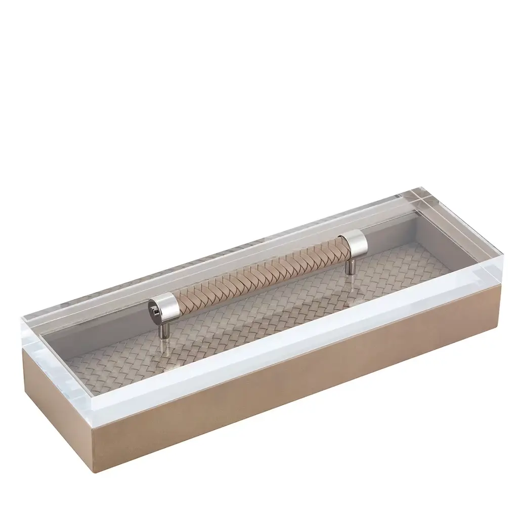 This elegant and versatile leather-covered box, part of the Lea Collection, is a testament to fine craftsmanship and timeless elegance. It boasts an acrylic lid with leather covered bamboo handle and quilted diamonds padded lining.