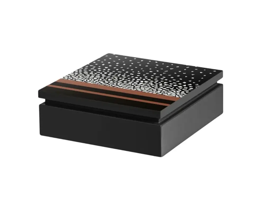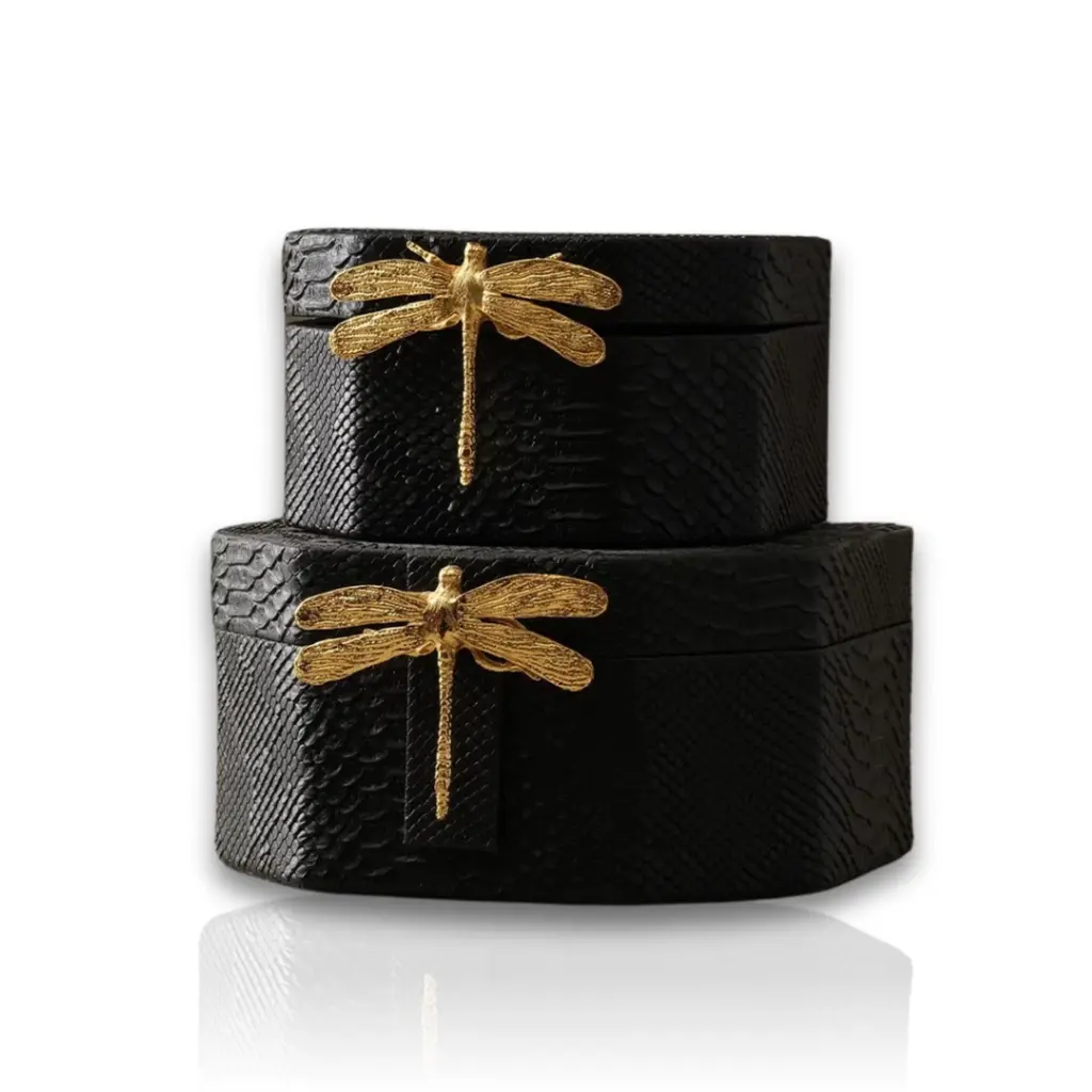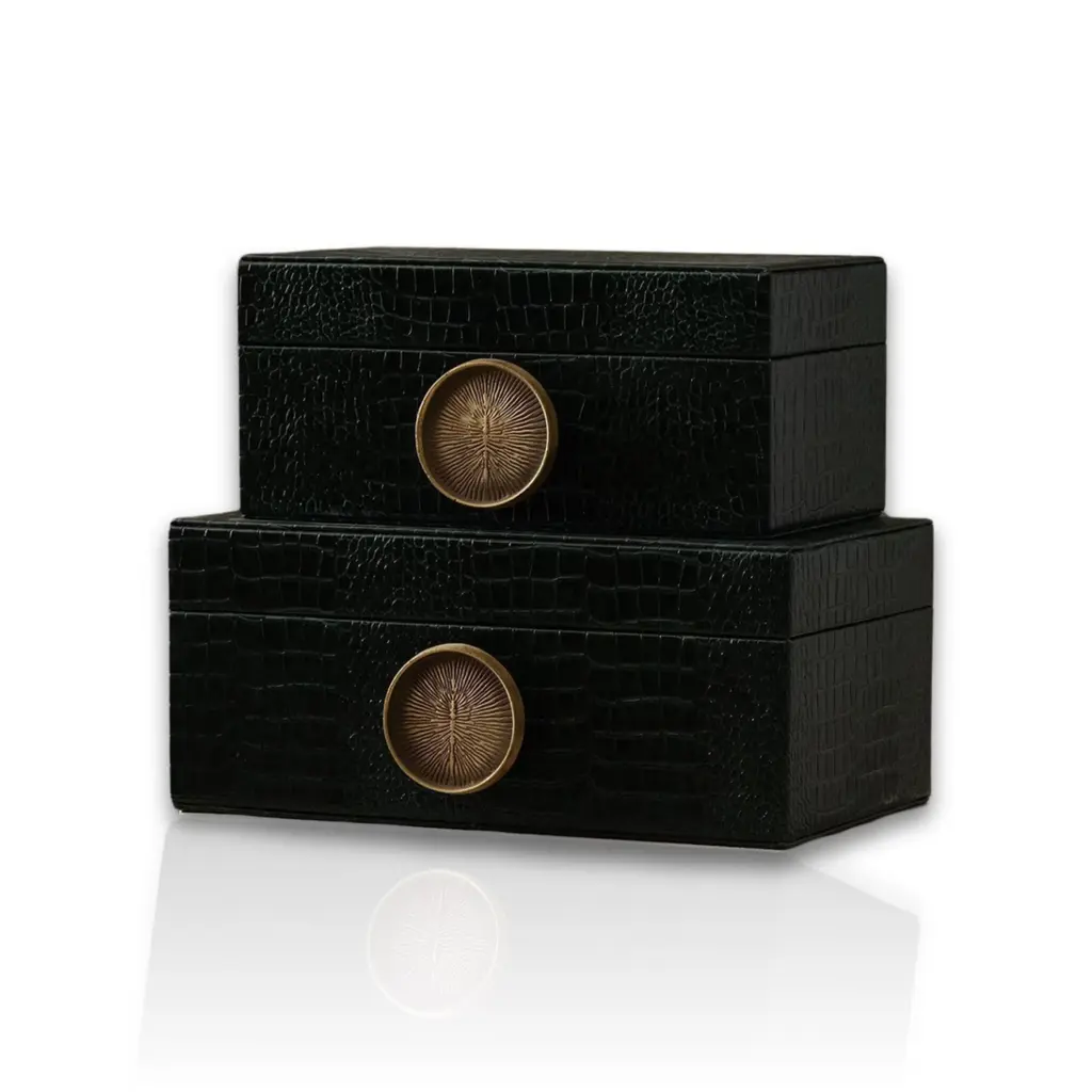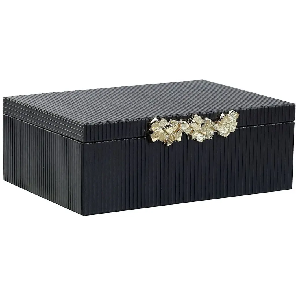 Felt Lined Wooden Box Covered In Navy Faux Leather With A Metallic Gold Leaf Handle.