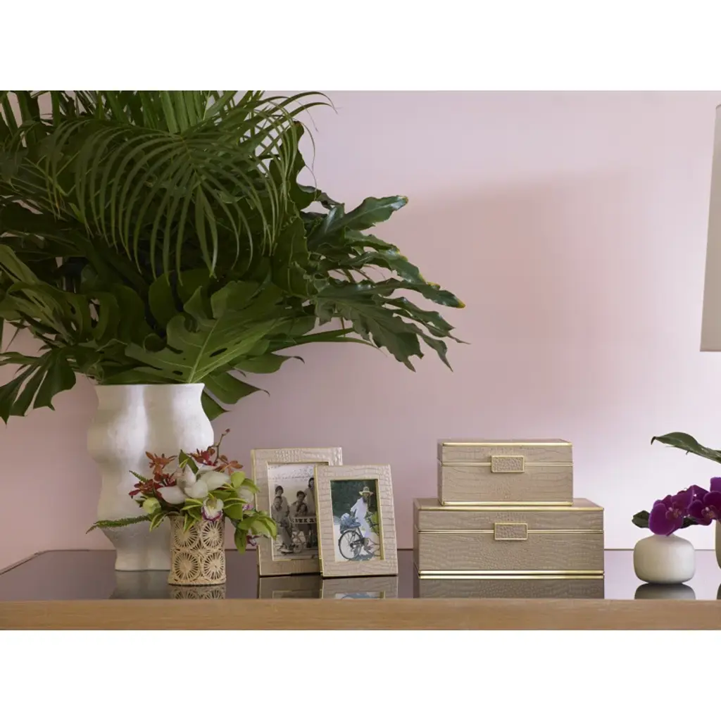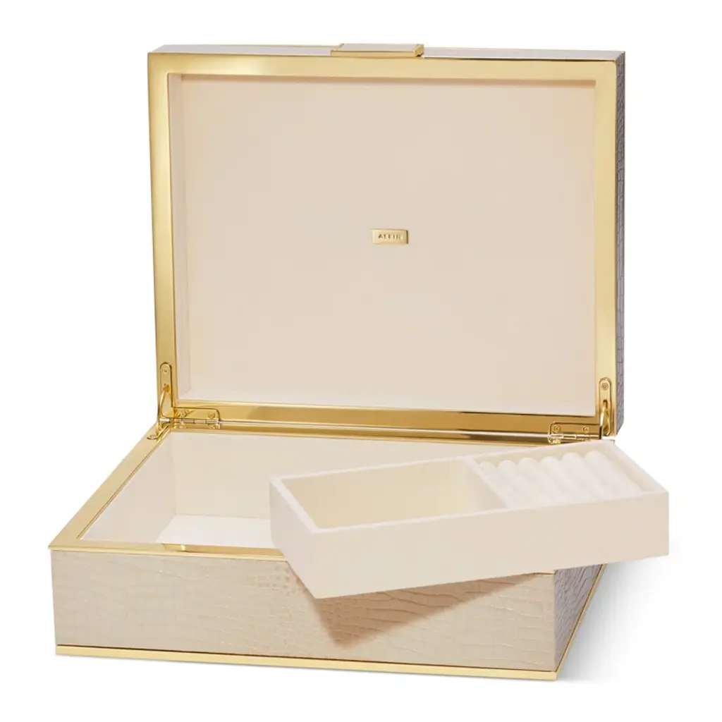 Bring a feminine touch to a vanity with this product. The luxurious velvet finish and brass edging speak to the romantic inspiration behind the collection. The plush, suede interior includes a top tray divided into five jewelry compartments, one for rings, and a larger area underneath to store personal items. A beautiful gift for a loved one.