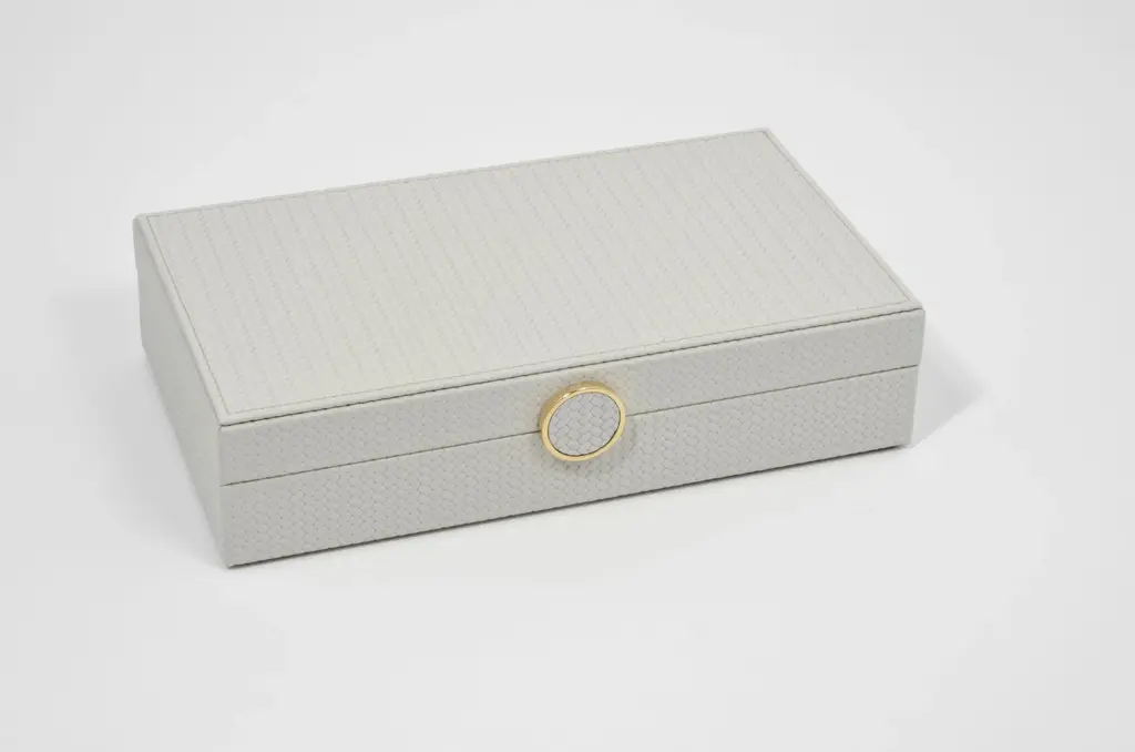 "Turning elegance in a modern way. That's what we did with our Prestige jewellery box. Our unmistakable leather texture covers this box embellished with shiny gold details and finished with soft suede inside." Imprinted by Maker