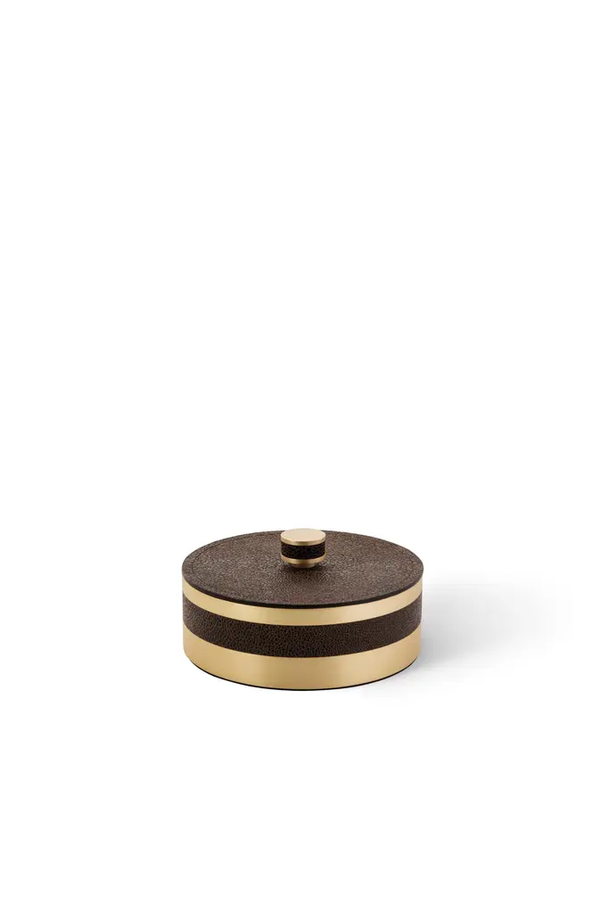 How we love this charming combination! Crafted with brushed brass and adorned with a cream leather, the Saturno box is an elegant addition to a powder room or anywhere in the house to keep your trinkets nicely sorted. Imprinted by Maker