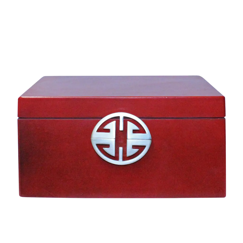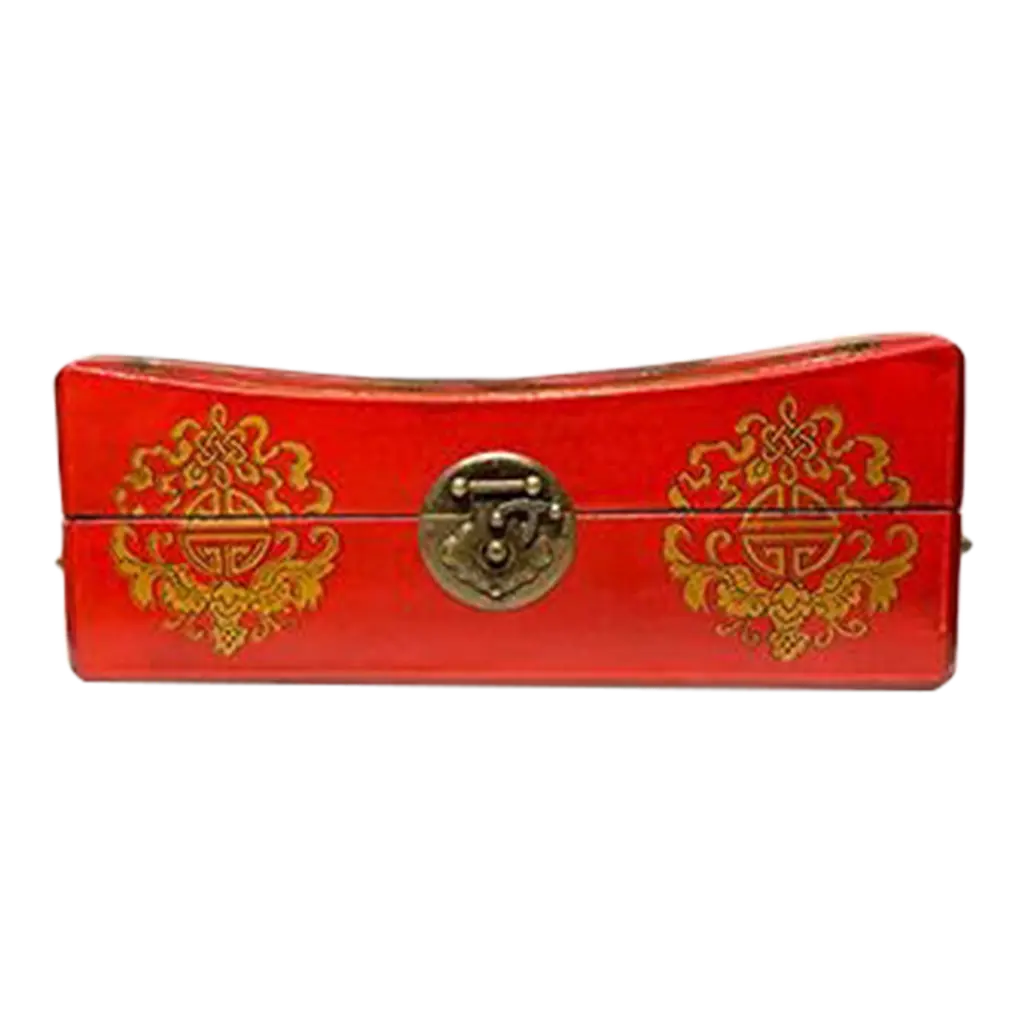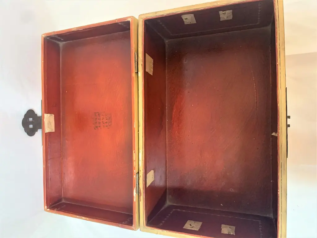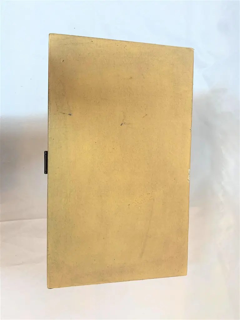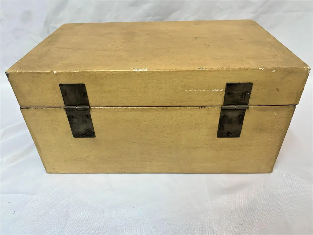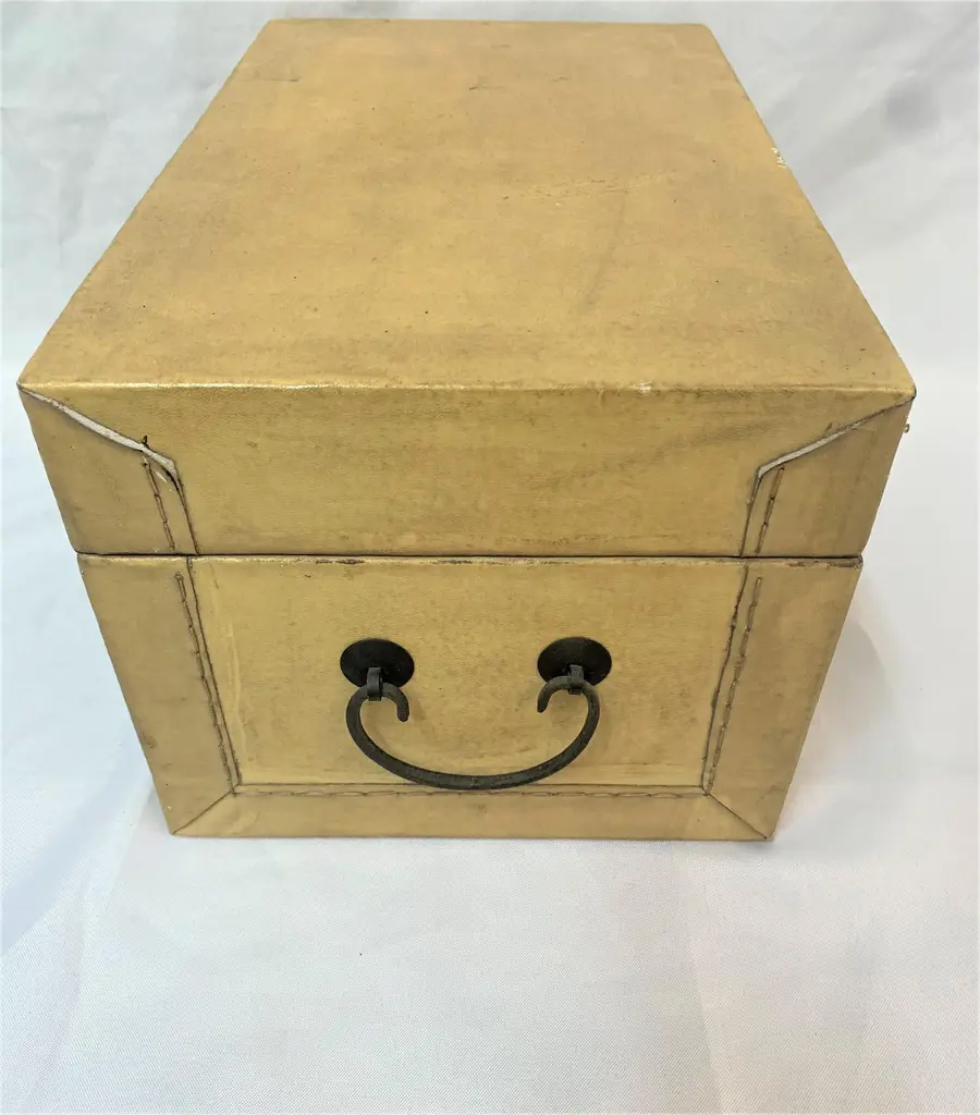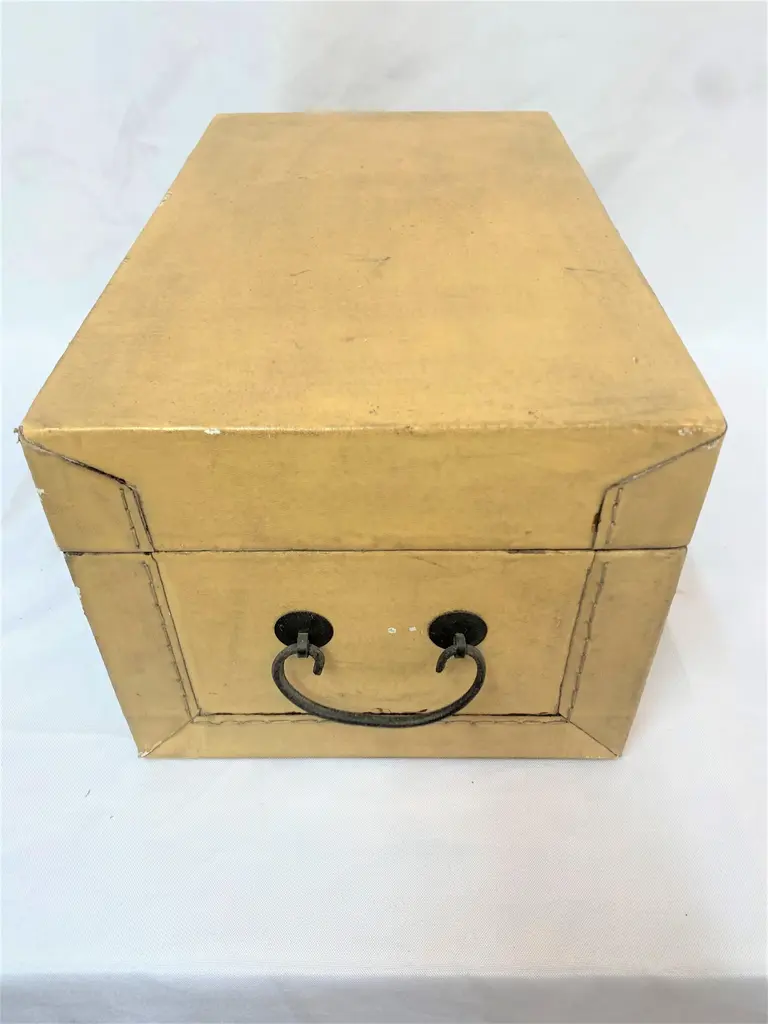 Our Leather box is high-quality functional storage. Versatile as you can use in any area of your home or office, accent in a bookcase, or use to keep any surface organized with functional storage. It can be a sophisticated coffee table box storing coasters and television remote controls. It can make a hectic office desk look more organized and elegant. Whatever it may be used for, it will look wonderful! Features include metal-U shaped handle on each side and, a brass-colored front closure. Some imperfections are consistent with the age of the piece. There are a few scuff marks and minor lifting at the seam but overall in good condition. Dimensions: 18 x 12 x 9 (Size Large)