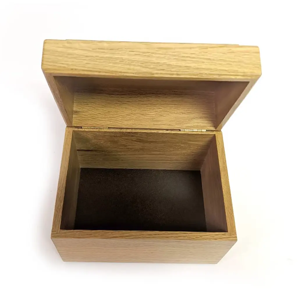 Safeguard your priceless handwritten recipes for generations to come. Nowadays they can be hard to find, but there's just no substitute for a good recipe box. We searched for years to find the perfect one, and this is it. Solidly built of beautiful oak, smooth protective finish shields wood from splatters. Recessed hinges in back provide a totally seamless look. The angled lid has a thin ledge to keep your recipe card in view while you cook. Durable tempered hardboard base (1/8" thick). Crafted by a local woodworker, it will become a treasured part of any kitchen. Holds approx. 300 cards. USA made.