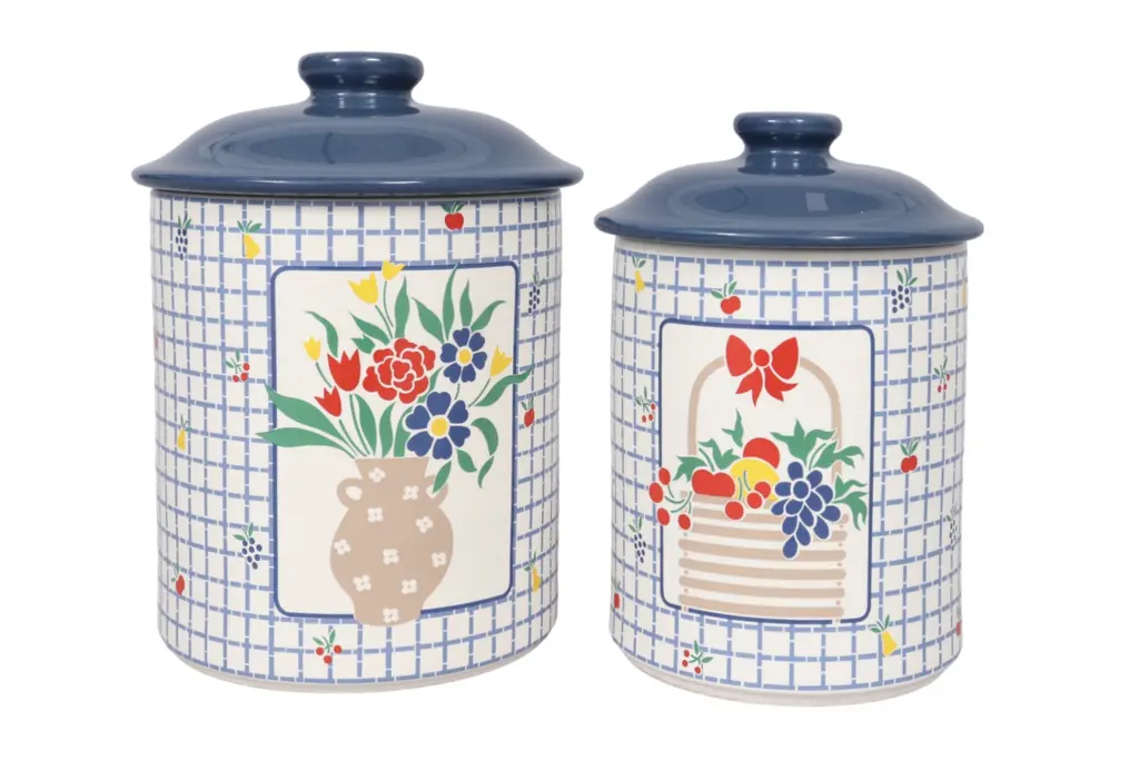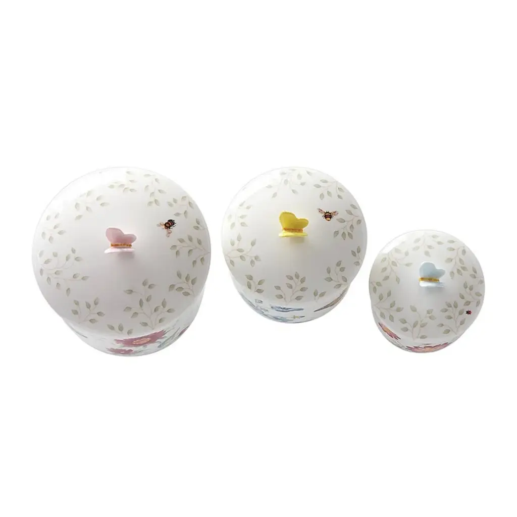A lively motif of butterflies, bees and flowers adorns the white porcelain surface of this Butterfly Meadow 3-piece canister set. These durable porcelain containers each feature a butterfly finial and are ideal for storing dry ingredients.