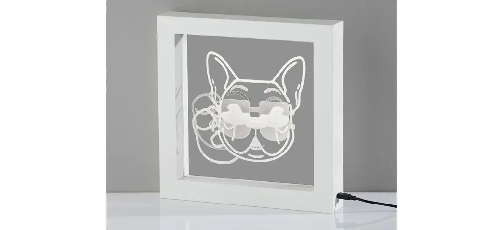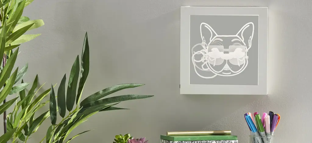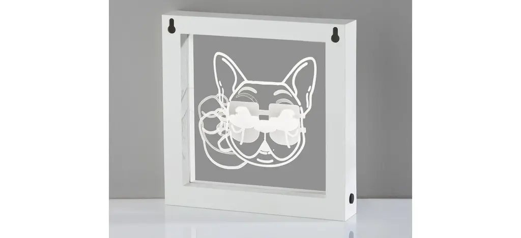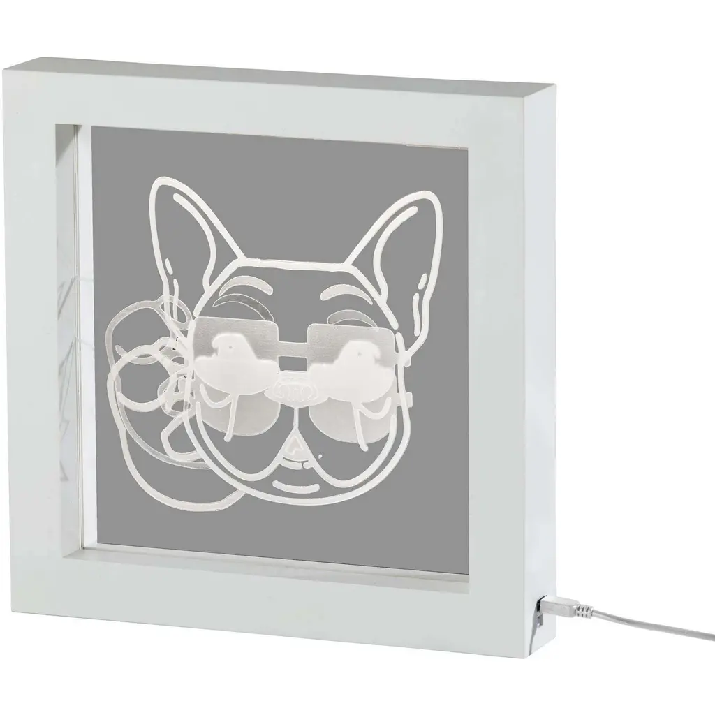 The Light Box lamp features a French bull dog in sunglasses art is illuminated in white LED light on this piece that can be wall mounted as eye-catching wall art or can stand free on tables, shelves, nightstands, or counters. The perfect choice for dog lovers with a pet as cool as they are! Measuring 9" tall by 9.25" wide including a plastic frame, this light box includes a 7.25" square window with art illuminated in white LED light. The light can be easily turned on or off with a push button switch. The 0.3W LED can be powered by either 3 AA batteries (sold separately) for a clean, wire-free aesthetic. Alternatively, the light box can be powered using the included 8' USB cable for unlimited use without needing to worry about replacing batteries.