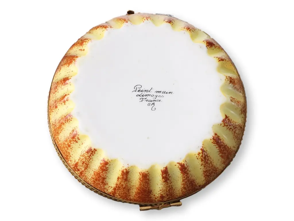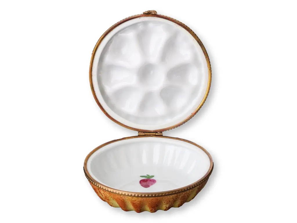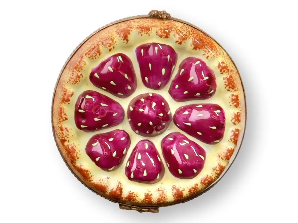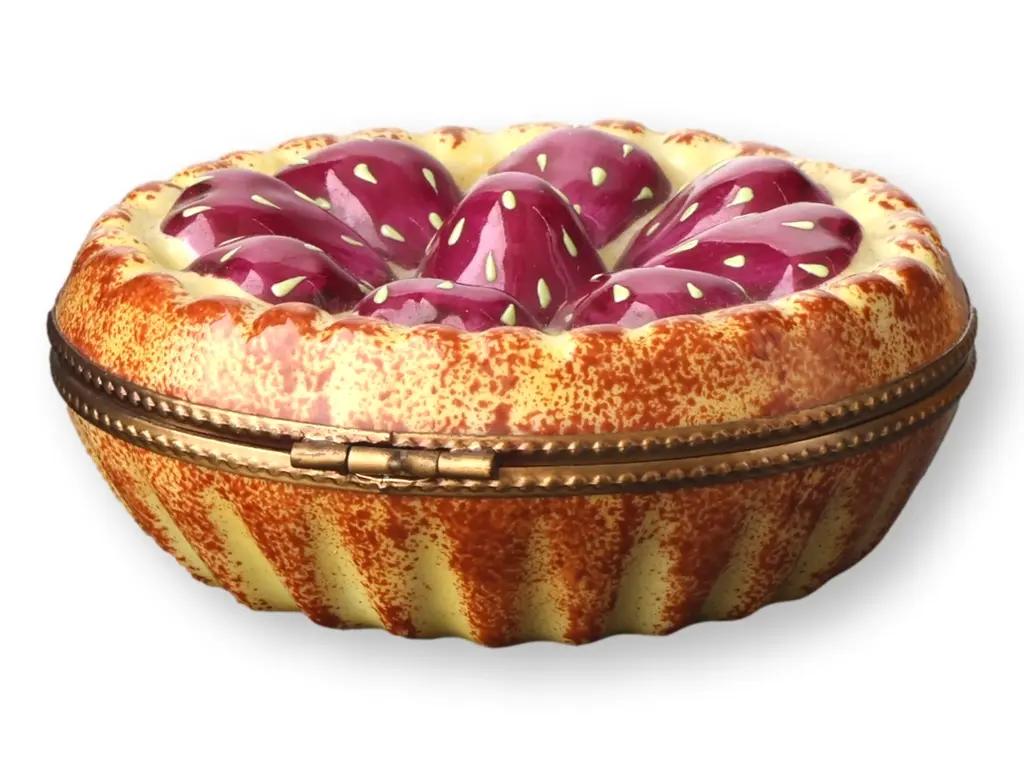Charming hand-painted Limoges porcelain box in the shape of a strawberry tart. Marked Peint Main (translates to Hand Painted) Limoges France, this hinged trinket box features vibrant glaze work, a gilt clasp, and finely modeled fruit detail. A sweet addition to any collection of French porcelain or culinary-themed decor.