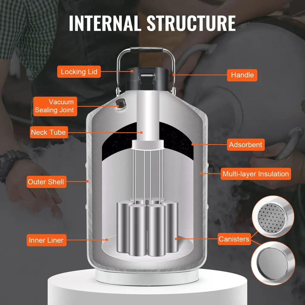 Lightweight and Durable Material: The liquid nitrogen tank is crafted from high-strength aviation-grade aluminum alloy, ensuring both portability and durability. This material effectively protects the stored liquid nitrogen and prevents scratches and deformation, ensuring safety and reliability during use. Vacuum Insulation Design: Surrounding the liquid nitrogen container with a multi-layer insulation structure and special gas adsorbents creates an excellent vacuum storage space. This minimizes heat transfer, maintaining a stable low-temperature environment inside the container and extending the storage time of samples. 6 Canisters: Our liquid nitrogen dewar is equipped with 6 canisters, including 2 without holes for precise nitrogen extraction and 4 with holes for storing samples, allowing users to quickly access or replace stored materials as needed. Portable Carry Bag: The protective cover prevents scratches and damage from accidental impacts, and adds an extra layer of protection. It's also easier to transport and carry, ensuring the cryogenic tank can be safely transported to laboratories, hospitals, or any other necessary location. Wide Applications: The LN2 container is widely used in laboratories, medical institutions, farms, beauty salons, and more. They can safely store a variety of samples, including semen, embryos, cells, dry ice, and metal materials, meeting diverse needs from biological research to industrial applications. Package Content 1 x Liquid Nitrogen Tank 1 x User Manual 1 x Protective Cover 6 x Canisters