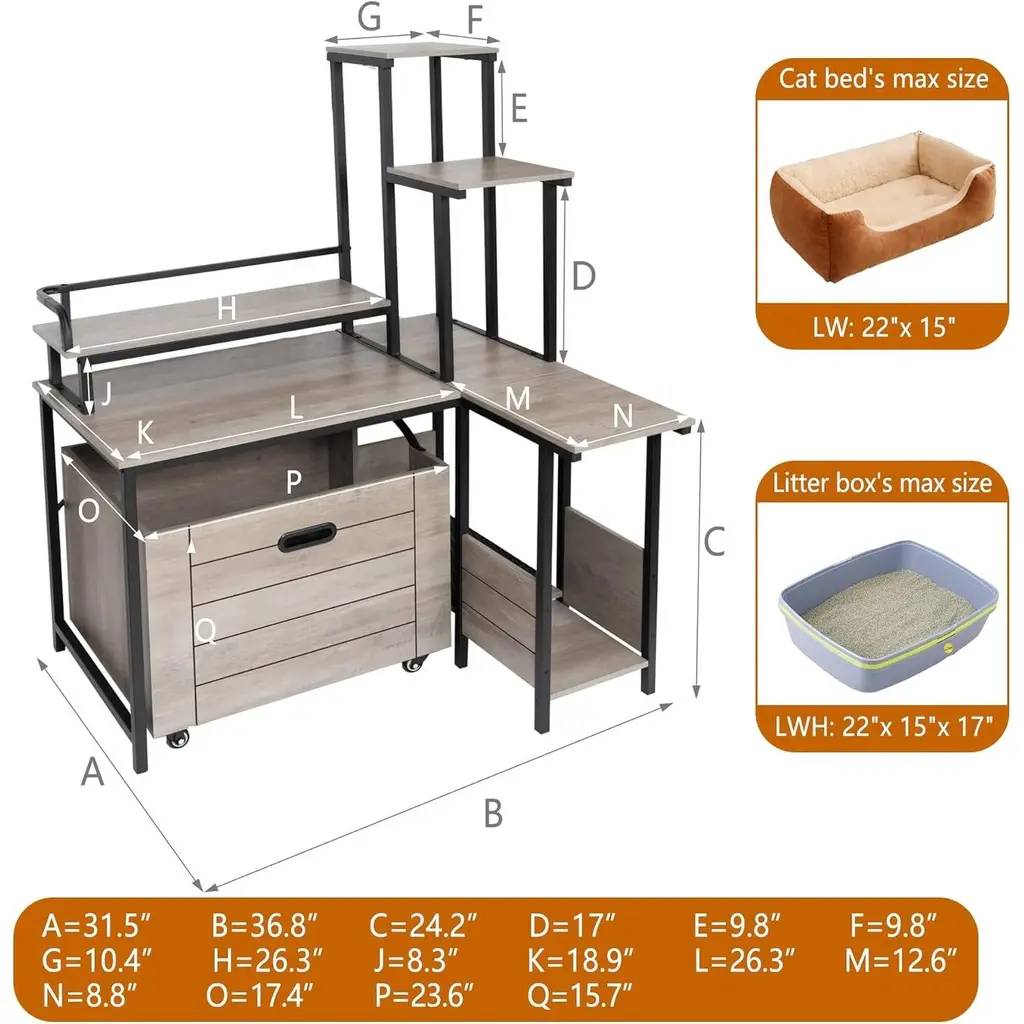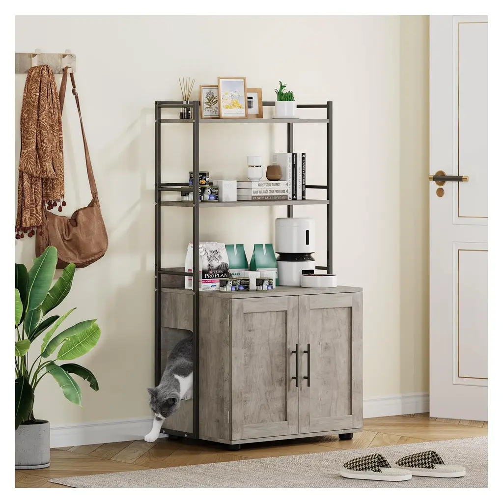 【Litter Box with 6-Layer Display Rack and Mobile Pet Cat Litter Box】: Introducing the ultimate solution for cat owners seeking both functionality and style—our innovative litter box with a 6-layer display rack and a mobile pet cat litter box. This product seamlessly combines practical litter box usage with creative storage and display options, making it the perfect addition to any pet-friendly home.【6-Layer Display Rack Provide Ample Storage Needs】: With a unique 6-layer display rack integrated into the design, this litter box is more than just a functional necessity. Each layer can be used to showcase your favorite decorative items, including plants, photos, or cat toys, turning an otherwise utilitarian space into a stylish nook in your home. This versatility allows you to personalize your pet’s area while keeping it organized and aesthetically pleasing.【Hidden Litter Box Design for Pets】: The hidden litter box concept provides both practicality and style. Many pet owners struggle with how to incorporate a litter box into their home decor without compromising aesthetics. This litter box enclosure elegantly addresses that concern. The discreet design ensures that your cat’s litter area is concealed from sight, making it less noticeable to guests while still allowing your feline friend easy access to their essential needs.【Mobile Pet Cat Litter Box with Easy Maintenance Work】:The mobile feature of this cat litter box makes maintenance a breeze. The litter box is designed to be light and easy to move, allowing you to adjust its position whenever needed—whether for cleaning purposes or based on your home’s layout. This is especially beneficial for busy cat owners who appreciate effortless access to their pet's litter area.【Enhanced Hygiene and Safety Litter box Furniture】: The thoughtful design of this litter box also promotes better hygiene.The enclosure helps contain odors and litter, preventing spills. Additionally, the use of high-quality materials ensures that the construction durable and easy to clean. Simply remove the litter box for effortless cleaning, maintaining a sanitary environment for your loved feline. Relaxing handle and mobile lockable wheels design energy-saving but also fixed itself easily.【Automatic Litter Box Integration with Usage Flexibility】: For those seeking the latest in convenience, this litter box is compatible with various automatic litter box systems. These automatic systems can be integrated into the enclosure, providing a self-cleaning option that significantly reduces the time and effort required for litter maintenance. Gone are the days of daily scooping; with an automatic litter box, you can enjoy a cleaner, fresher environment for both you and your cat.