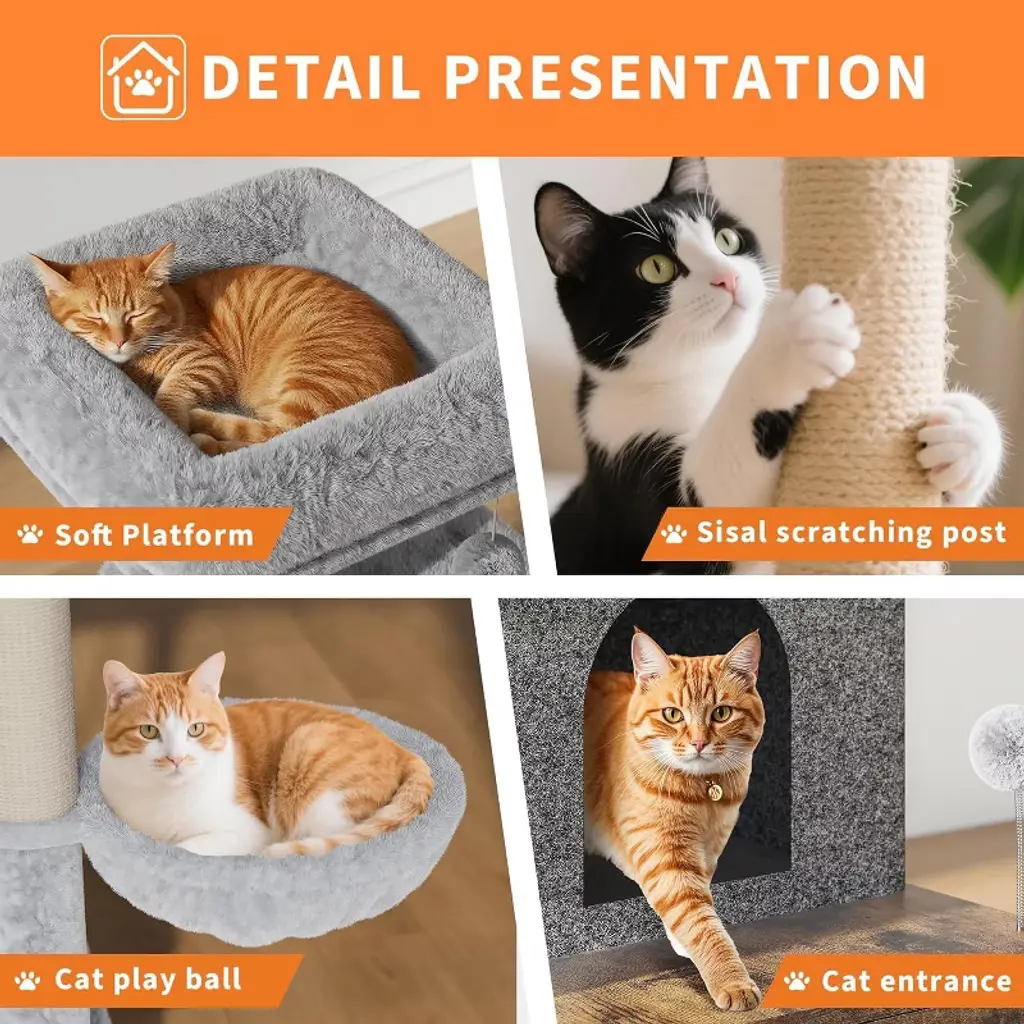 Cat Tree with Litter Box Enclosure, 2-in-1 Modern Cat Tow for Indoor Cats, Cats Furniture Hidden Washroom, Multi-Functional Cat Furniture with Scratching Posts, Dangling Ball, Hammock, combines a discreet litter box cabinet, multi-level cat tree with play perches, and a plush sleeping condo in one compact unit. Perfect for small spaces, meeting all needs of small to medium cats without clutter.