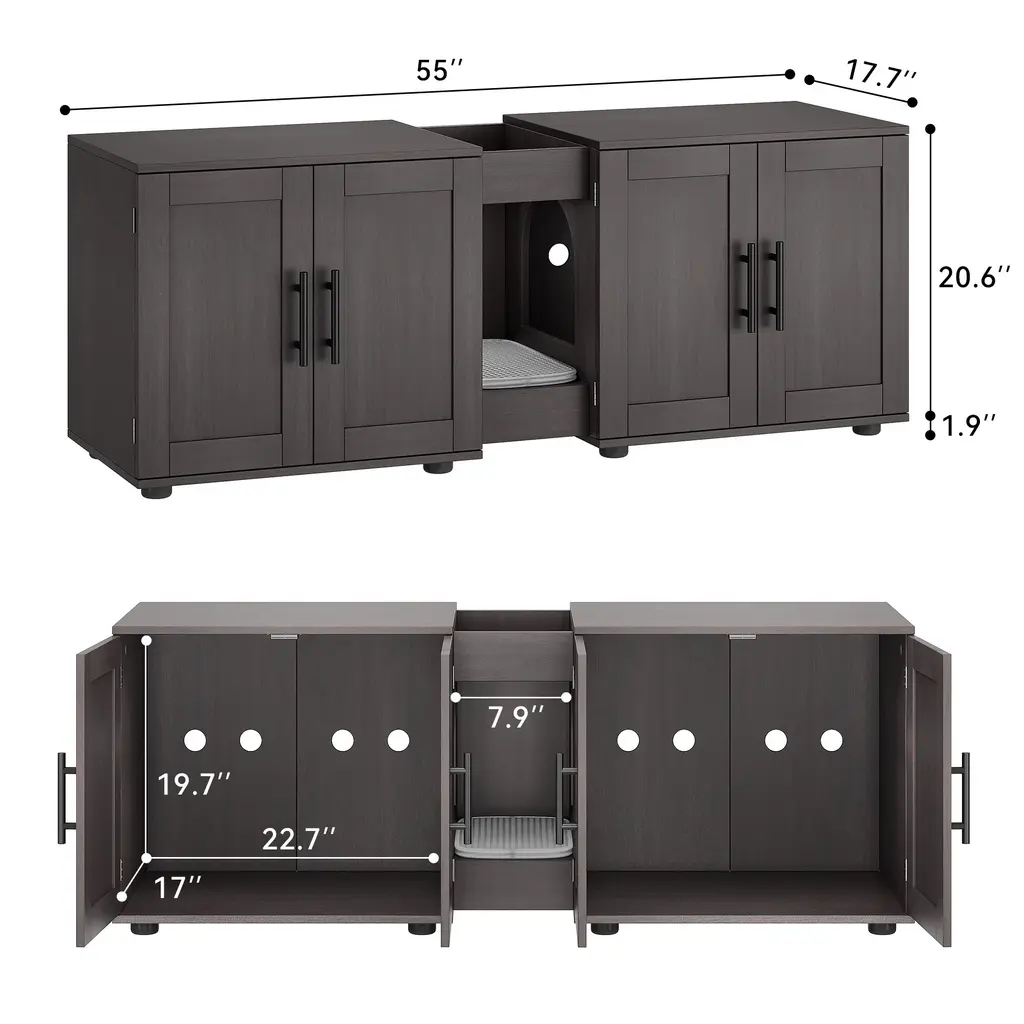 ??Double-room cat litter cabinet design: Our spacious and luxurious two-room cat litter cabinet provides ample space for two cats to comfortably use at the same time. With dimensions of 55"L x 17.7"W x 22.5"L, it can easily accommodate most cat litter boxes, ensuring a convenient and stylish solution for your cats. ??Integrated furniture: Our double-cage cat litter cabinet serves a dual purpose, functioning not only as a cat house but also as a private and secluded cat toilet. This multi-functional piece can also be utilized as a TV cabinet, coffee table, or other decorative furniture, adding both practicality and elegance to your living space. ??Intimate cat mat: Our cat litter cabinet is equipped with a high-quality cat mat in the middle, which can effectively reduce the residual litter brought by cats from the litter box, making your house tidier and cleaner and reducing odor. ??Sophisticated design: Our double-cage cat litter cabinet features a carefully designed entrance hole in the middle section, allowing for easy access for your cats while promoting proper ventilation and lighting within the interior space. Additionally, the cabinet is constructed with waterproof materials, making it effortless to clean and maintain. ??Convenient storage: We understand the importance of organization. That's why our cat litter cabinet incorporates a groove in the middle section, serving as a storage compartment for canned cat food and other supplies. This practical design element not only maximizes storage space but also promotes a tidy and orderly environment. Features: High quality hardware handle The high-grade hardware handle exhibits exceptional durability and offers utmost convenience when it comes to effortlessly opening and closing the door of the cat litter cabinet. Comes with hardware door catch Complementing its design, the cat litter cabinet is equipped with a distinctive and reliable hardware door catch that significantly enhances the secure closure of the cabinet door. Waterproof and easy-to-clean panel Crafted from premium waterproof materials, the panel of the cat litter cabinet exhibits exceptional efficacy in safeguarding against unsightly stains and residual cat litter resulting from playful cat activities.