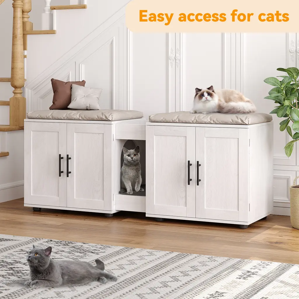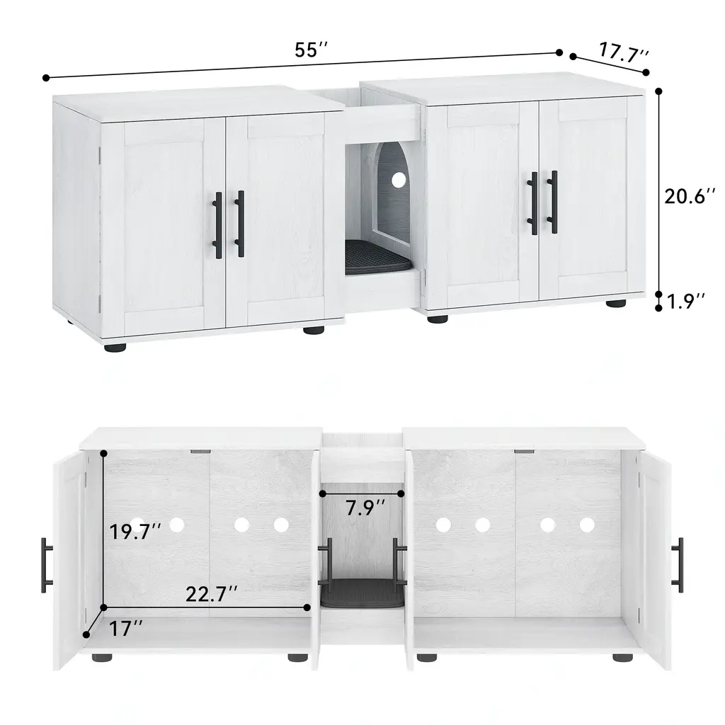 ??Double-room cat litter cabinet design: Our spacious and luxurious two-room cat litter cabinet provides ample space for two cats to comfortably use at the same time. With dimensions of 55"L x 17.7"W x 22.5"L, it can easily accommodate most cat litter boxes, ensuring a convenient and stylish solution for your cats. ??Integrated furniture: Our double-cage cat litter cabinet serves a dual purpose, functioning not only as a cat house but also as a private and secluded cat toilet. This multi-functional piece can also be utilized as a TV cabinet, coffee table, or other decorative furniture, adding both practicality and elegance to your living space. ??Intimate cat mat: Our cat litter cabinet is equipped with a high-quality cat mat in the middle, which can effectively reduce the residual litter brought by cats from the litter box, making your house tidier and cleaner and reducing odor. ??Sophisticated design: Our double-cage cat litter cabinet features a carefully designed entrance hole in the middle section, allowing for easy access for your cats while promoting proper ventilation and lighting within the interior space. Additionally, the cabinet is constructed with waterproof materials, making it effortless to clean and maintain. ??Convenient storage: We understand the importance of organization. That's why our cat litter cabinet incorporates a groove in the middle section, serving as a storage compartment for canned cat food and other supplies. This practical design element not only maximizes storage space but also promotes a tidy and orderly environment. Features: High quality hardware handle The high-grade hardware handle exhibits exceptional durability and offers utmost convenience when it comes to effortlessly opening and closing the door of the cat litter cabinet. Comes with hardware door catch Complementing its design, the cat litter cabinet is equipped with a distinctive and reliable hardware door catch that significantly enhances the secure closure of the cabinet door. Waterproof and easy-to-clean panel Crafted from premium waterproof materials, the panel of the cat litter cabinet exhibits exceptional efficacy in safeguarding against unsightly stains and residual cat litter resulting from playful cat activities.
