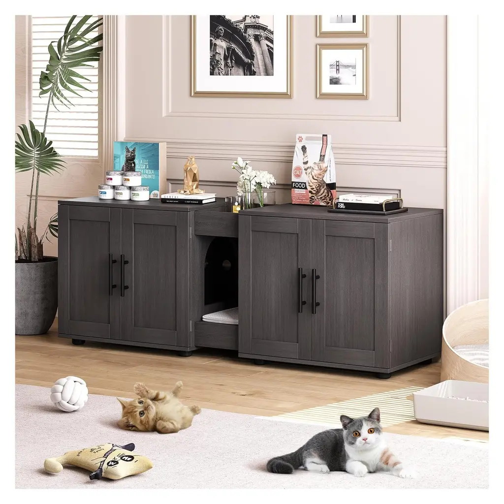 The Litter Loo Bench Litter Box is made with ECOFLEX(R), a proprietary composite blend of recycled polymers and reclaimed wood fiber by-products. The ECOFLEX(R) material is non-toxic, eco-friendly & impervious to moisture & odor, making it the perfect material for your pets' furniture. The LitterLoo(R) Bench is great for automatic litter boxes with its removable or multi-position divider. Developed as a discreet, beautiful piece of home decor, the opening panel can be positioned on either side depending on each pet owners preference. Easy to assemble and easy to clean. Litter Box not included.
