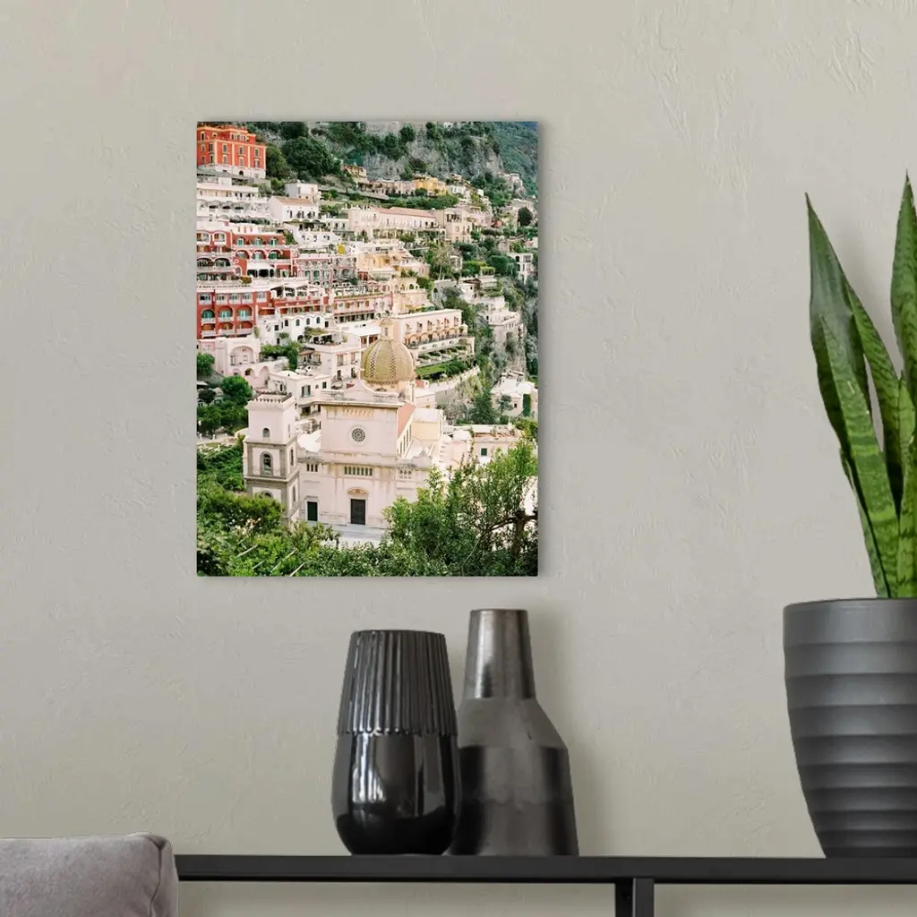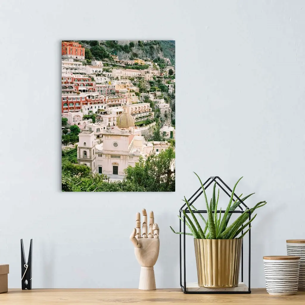 Photograph of the houses and buildings of Positano, Italy perched on the steep hillside.