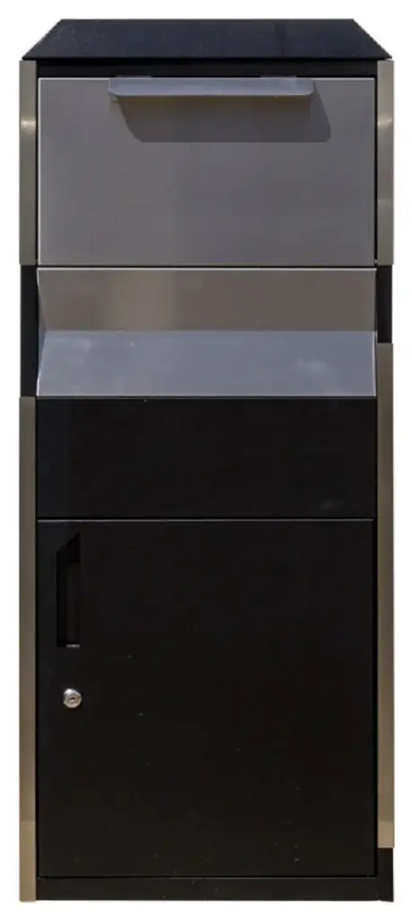 Locking Parcel Drop Box In Black With Stainless SteelDo you need more room? The Winfield Locking Parcel Drop Box is a freestanding locking parcel mailbox which can hold several small packages and mail. Built from thick heavy gauge galvanized steel, parcel box has a tough black powder coated finish, stainless steel incoming mail slot and stainless steel accents along the corners. Mail/parcel retrieval locking retrieval door has a handle for easy open and shut. Incoming parcel door also has a handle for easy open and shut and can receive a maximum parcel size of: 13.5" W x 7" H x 10" D. Parcel opening: 7" H x 13.5" W x 12" D . Parcel box includes lock, a set of keys and four anchors to mount onto concreate pad. Built from heavy thick gauge galvanized steelBlack powder coat finish with stainless steel accentsRoomy interior holds numerous pieces of mail and small parcelsStainless steel incoming mail slotMail/parcel locking door features a handle for easy open and shutLock and set of keys included